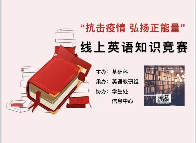 本次英语知识竞赛由基础科英语组主办,学生处、信息中心等部门协办,旨在增强同学们与祖国、与学校同命运共呼吸、休戚与共的使命担当,共同抗击疫情,弘扬正能量,同时丰富疫情期间同学们的学习生活,锻炼同学们的英语语言综合能力。比赛围绕防疫主题设计,内容涵盖多方面防疫防控知识。竞赛内容主要涉及国家政策、新冠肺炎特点及传播方式、公共场所如何防护、居家如何防护、甄别谣言及相关防疫要求等。通过本次竞赛,同学们全方位,多层次学习了防疫、抗疫知识。