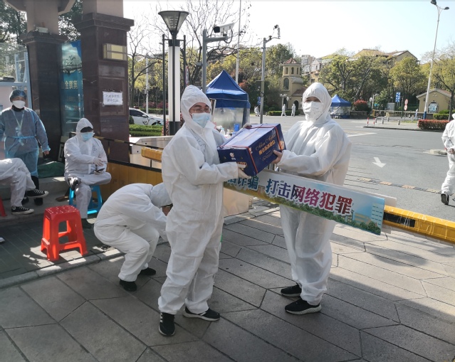 家有两娃的高文杰、金磊老师,在做好“主播”工作之余,舍小家为大家,多次参加社区疫情防控志愿者工作。2022年3月13日中午,他们居住的金悦华庭小区开始进行封控管理。面对突然的封控,小区居委会紧急招募志愿者,他们义无反顾的报名参加。在社区核酸检测、抗原体检测、收发快递运送物资、进行疫苗登记、发放通行证等方面的疫情防控工作队伍中都有他俩的身影。根据社区防疫工作要求,像维持检测秩序、到不同楼栋呼叫居民分时段进行检测、帮助老人在健康云进行“核酸检测登记”等工作,对他们来说已经是轻车熟路。在第一批抗原体检测过程中,第一次接触的居民都不知道如何使用,他们耐心指导,做好后及时进行回收登记,得到居委干部和居民的一致称赞。在核酸检测最初阶段,速度比较慢,从志愿者开始准备工作到结束收尾,接近7个小时,期间穿着严密的防护服不能上厕所、不能喝水。而面对困难他们总是积极乐观应对。因为他们知道,作为党员就是要在国家、社区需要的时候挺身而出,发挥党员的先锋模范作用。