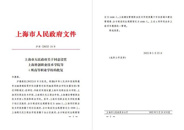 2022年5月25日,上海市人民政府正式下发了《上海市人民政府关于同意设置上海科创职业技术学院等4所高等职业学校的批复》(沪府〔2022〕24号)。上海现代化工职业学院成功通过评审,获得高等职业学校设置批复,这是金山区高等教育领域的一大重要突破,更是我校发展历程中一座重要的里程碑。