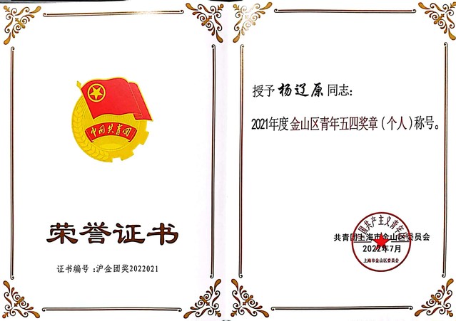 宝剑锋从磨砺出,梅花香自苦寒来。近日,我校杨辽原老师荣获2021年度金山区青年五四奖章(个人)。
