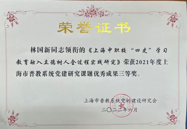 近日,市普教系统党的建设研究会遴选出2021年度党建研究课题优秀成果,原校党委书记林国新领衔的《上海中职校“四史”学习教育融入立德树人全过程实践研究》荣获优秀成果三等奖。
