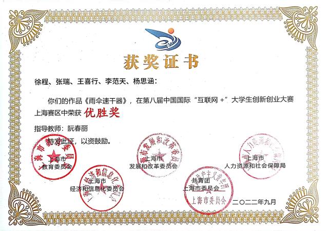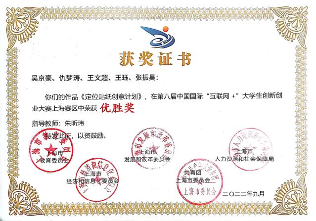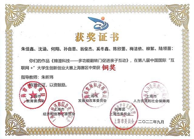 为全面落实习近平总书记给中国“互联网+”大学生创新创业大赛大学生回信重要精神,深入推进大众创业万众创新,加快培养创新创业人才,今年6月上海举办了以“我敢闯、我会创”为主题的第八届中国国际“互联网+”大学生创新创业大赛。近日传来佳讯,我校学生朱佳鑫、沈涵、何翔、孙自恩、翁俊杰、奚冬鑫、陈欣蕾、梅洁依、柳絮、陆领苗10位同学组队在第八届中国国际“互联网+”大学生创新创业大赛上海赛区获得铜奖。吴京豪、仇梦涛、王文超、王珏、张振昊等同学获优胜奖。
