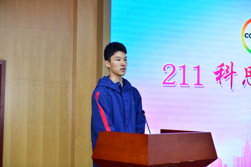 211科思创班班长王心恺代表全班24名同学上台发言。王心恺表达了全体同学对科思创的向往之情,并表明了大家的决心,承诺会带领全班同学共同努力,勇往直前,实现梦想。