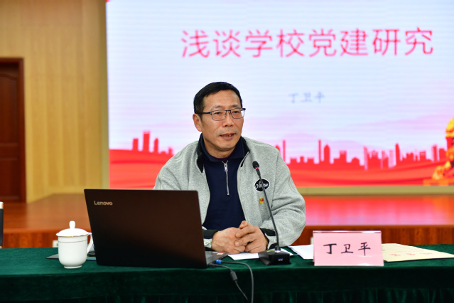 仪式结束后,研究会特邀区教育局党建督导办公室主任丁卫平作专题辅导报告。丁卫平从学校党建、党建研究和课题申报三个方面入手,并以个人申报的党建课题为例,细致讲解了课题申报过程中的重点及注意事项,为我校广大党建课题研究者开展工作提供了有力指导。校党建研究会秘书处、校科研处负责人作交流发言。
