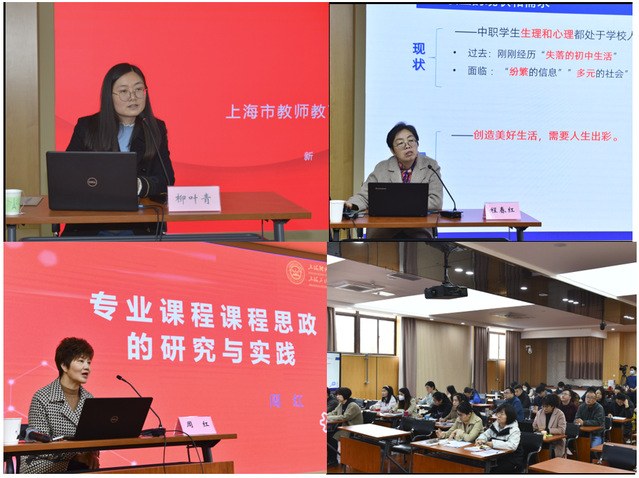 本次培训分专题报告、学员案例分享、分组讨论等多个环节,主题讲座邀请了上海市教委教研室柳叶青博士、上海工商信息学校程春红老师及我校智能制造学院周红老师,分别围绕专业课程思政作了“职业院校构建课程思政教学体系的路径与案例”、“如何跨越:从实践到文本”、“专业课程课程思政的研究与实践”主题讲座,与学员们分享课程思政建设的经验和心得。上海大众工业学校张秀芹、我校陈姗、臧欢及俞婕等4位教师分别就各自所撰写的专业课程思政教学案例和学员做了分享交流。