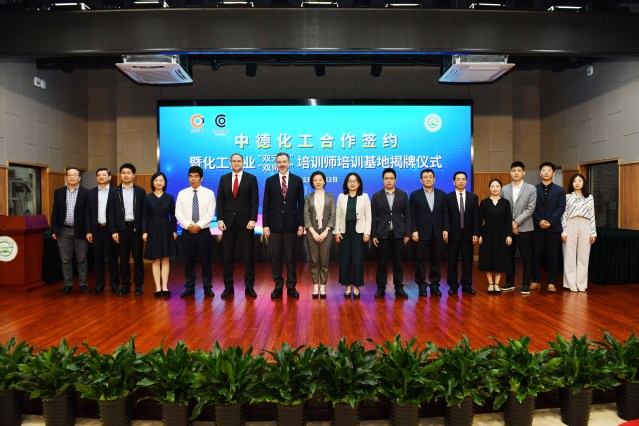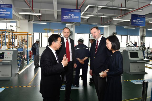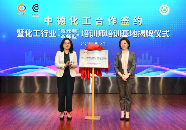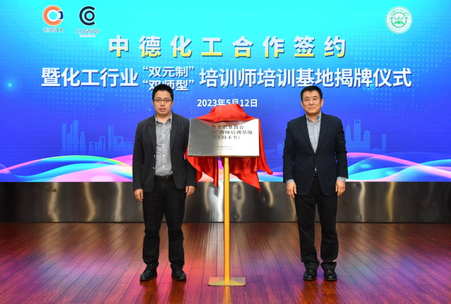 沈磊、郑瑛共同为“化工行业双元制培训师培训基地”揭牌。基地旨在以“双元制”培训师培训标准为蓝本,提高化工职业教育教师解决实际问题的能力,以及国际化教学资源开发与教学实施能力,提升职业教育与培训质量。