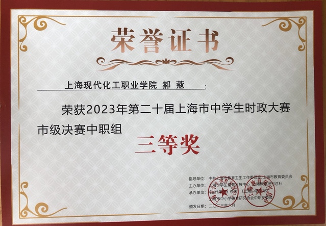 5月27日上午10点,上海市中学生时政决赛在上海市商业学校、上海商业会计学校举行,功夫不负有心人,在全市决赛中,我校尹子恒同学荣获二等奖,郝蔻、沈欢喜同学荣获三等奖,其他同学获得了优胜奖。