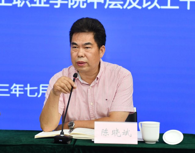 陈晓斌强调,在过去一年的发展中,学校顺利实现从中职到高职的跨越,迈入了新的发展台阶。围绕下半年重点工作,他从“以专业建设为龙头、以队伍建设为核心、以制度建设为保障、以融合办学为特色”四大方面,深入细致地阐述了学校学生管理、教学科研与后勤服务三大条线重点工作的建设思路与应对举措,明确下半年未来的工作方向。他希望,干部队伍提高政治站位,积极担当作为,朝着“一流的教学、一流的管理、一流的后勤服务”团结奋进。