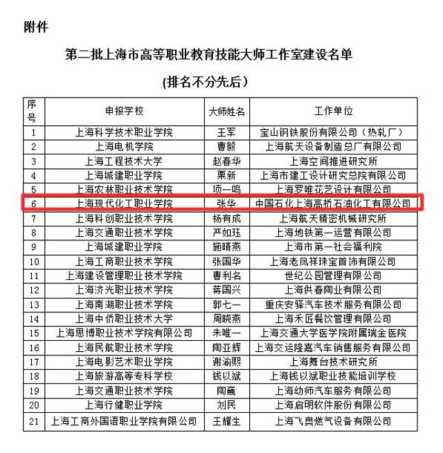 近日,上海市教育委员会公布了第二批上海市高等职业教育技能大师工作室建设名单,我校化学工程学院市级特聘兼职教师张华入选。