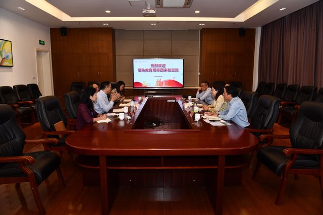 为全面落实教育部加快推进现代职业教育体系建设改革重点任务及长三角区域一体化发展战略,10月24日,常熟市教育局局长杨俊达、常熟市教育局副局长陈丹、江苏省常熟中等专业学校党委书记苏建青、常熟市滨江职业技术学校党总支书记张恒一行4人来访学校,党委书记高炬热情接待了来宾。