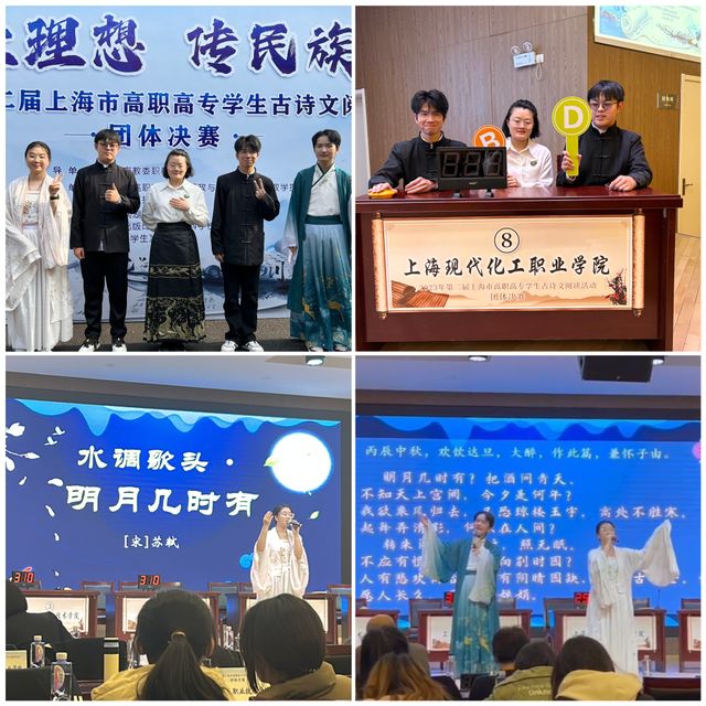 为深入学习贯彻党的二十大精神,落实习近平总书记关于教育的重要论述,进一步推进上海高职高专学校课程思政内涵式发展和质量提升,帮助本市高职学生树立职业理想,丰富职业教育体验活动内涵,在上海市教育委员会职业教育处指导下,上海高职高专课程思政与文化素养教育教学指导委员会、上海教育报刊总社联合举办了“树职业理想传民族精神”——2023第二届上海市高职高专学生古诗文阅读活动。在通过各院校海选初赛、全市线上复赛之后,我校平均成绩排名进入前8位,顺利晋级上海市团体决赛。