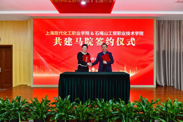 杜海燕和寇立红分别代表上海现代化工职业学院和石嘴山工贸职业技术学院签订共建马院协议。