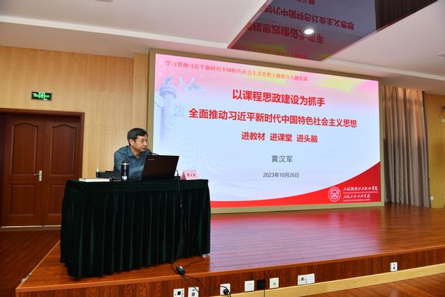 落实习近平新时代中国特色社会主义思想进教材进课堂进头脑工作,是培养学生对中国特色社会主义和加强党的全面领导的政治认同、思想认同、情感认同,强化使命担当的重要举措。按照区委、区教育工作党委相关要求,10月26日,副校长黄汉军在深入学习思考的基础上,结合分管工作,以“以课程思政建设为抓手,全面推动习近平新时代中国特色社会主义思想进教材进课堂进头脑”为题讲授专题党课。各二级学院院长、教研室主任、思政教师及智能制造学院党支部党员参加党课学习。