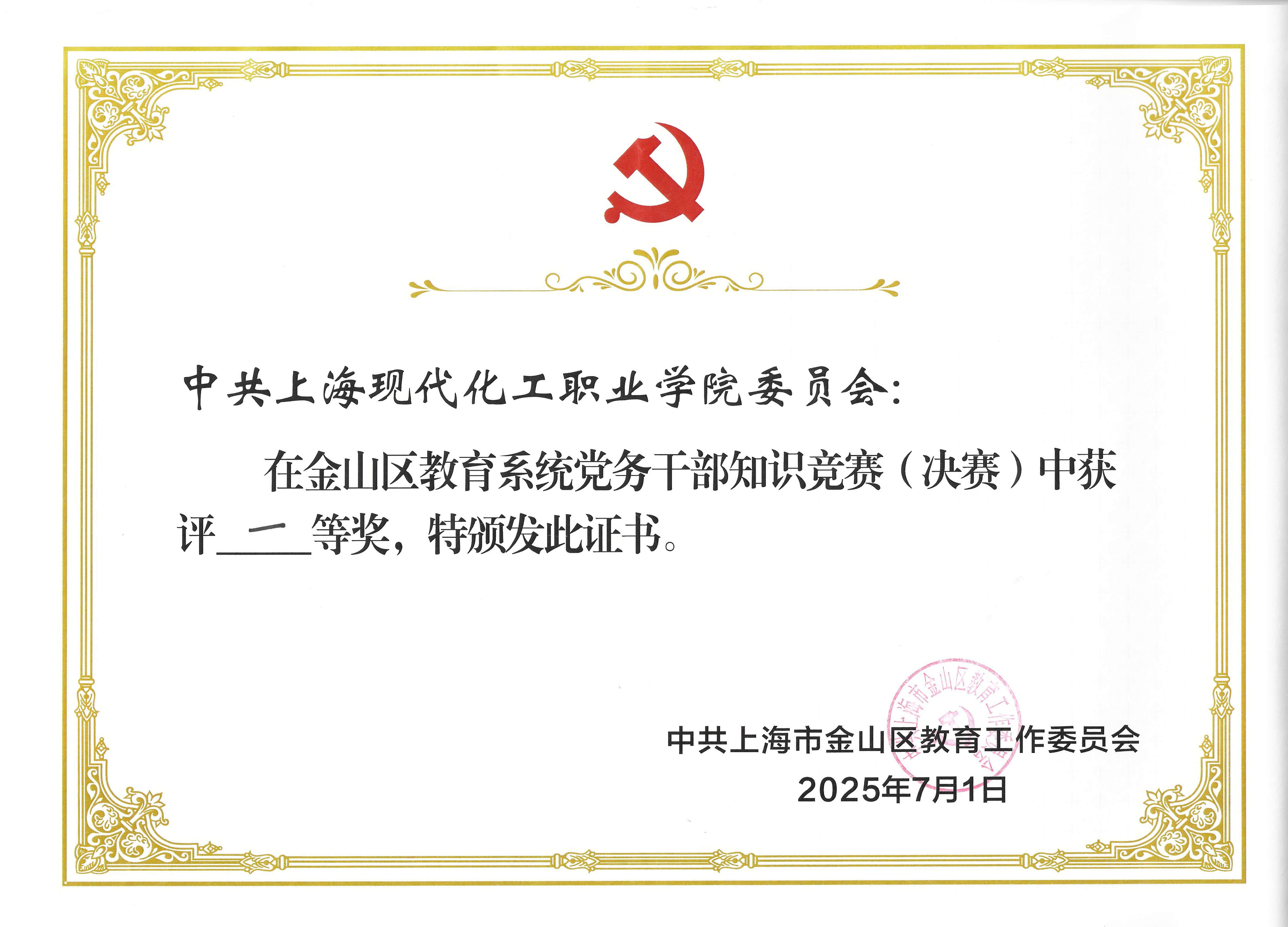 本次竞赛分为初赛和决赛两个阶段。4月25日,初赛在金山区教育学院举行。比赛通过现场闭卷笔试的形式,以填空、单选等多元题型,全面检验参赛者对党章党史、党内法规等核心内容的掌握程度。我校由联合科室党支部书记刁小伟、教务系统党支部书记俞婕、基础经贸党支部书记于燕娜组成的参赛队从34 支队伍、102 名党务干部中脱颖而出,和另外5支代表队获得了决赛入场券。