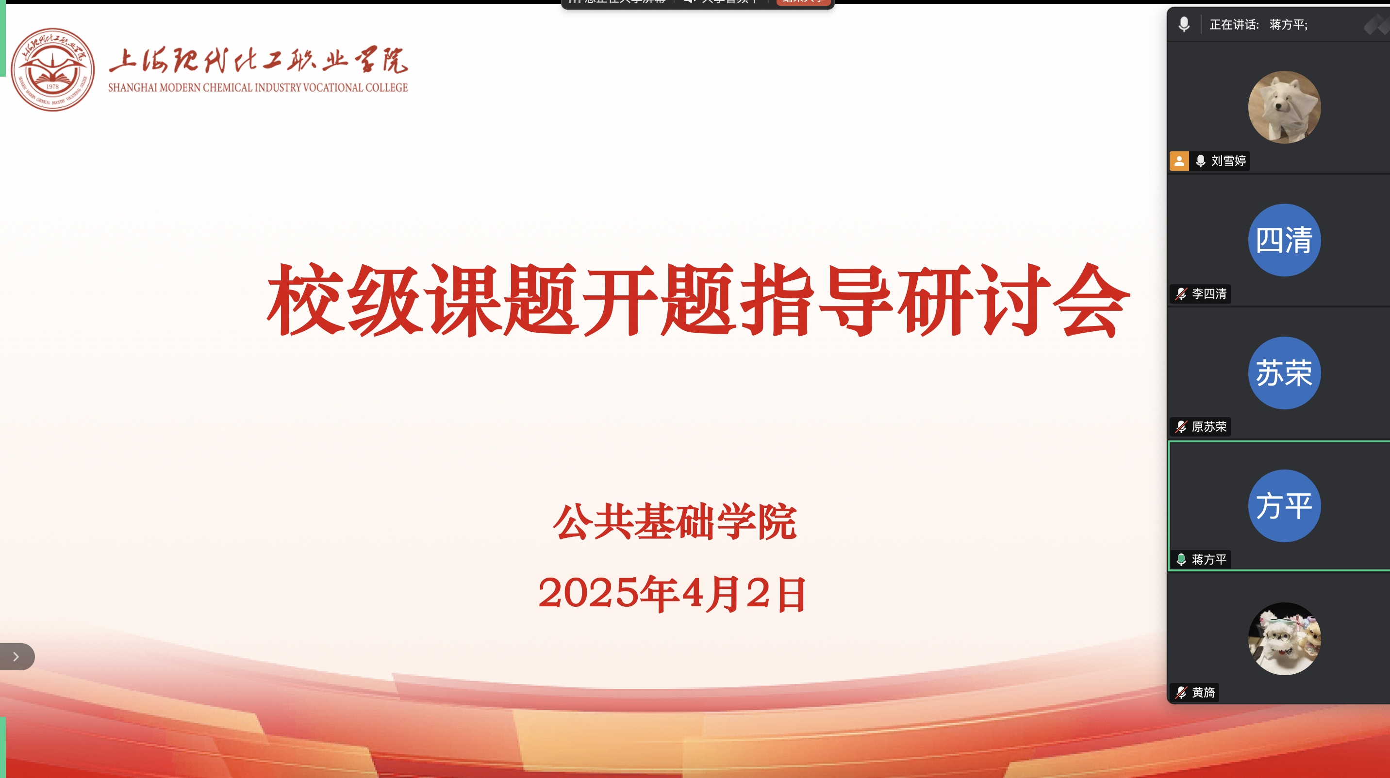 为确保课题研究实效,提升课题研究的质量,4月2日,公共基础学院特邀上海师范大学外语学院原苏荣教授、李四清教授为学院青年教师进行了校级课题的专项评审和指导,公共基础学院院长蒋方平、课题组负责人和成员参加了本次会议,会议以线上方式进行。