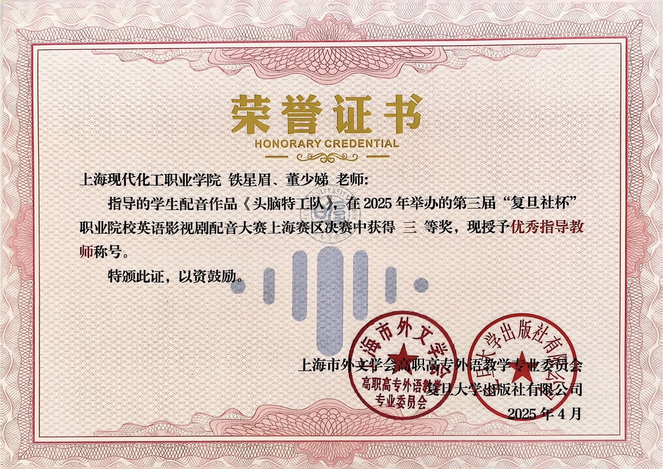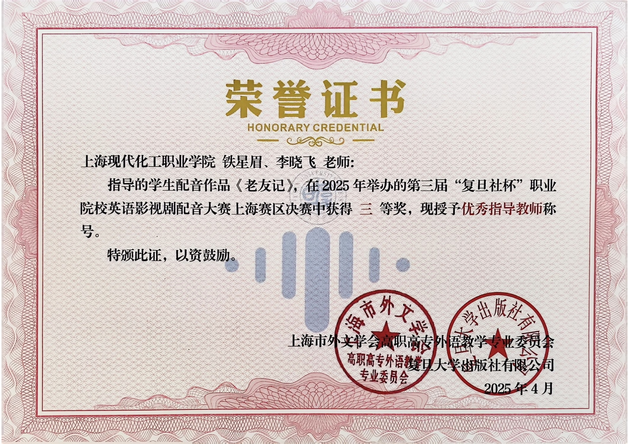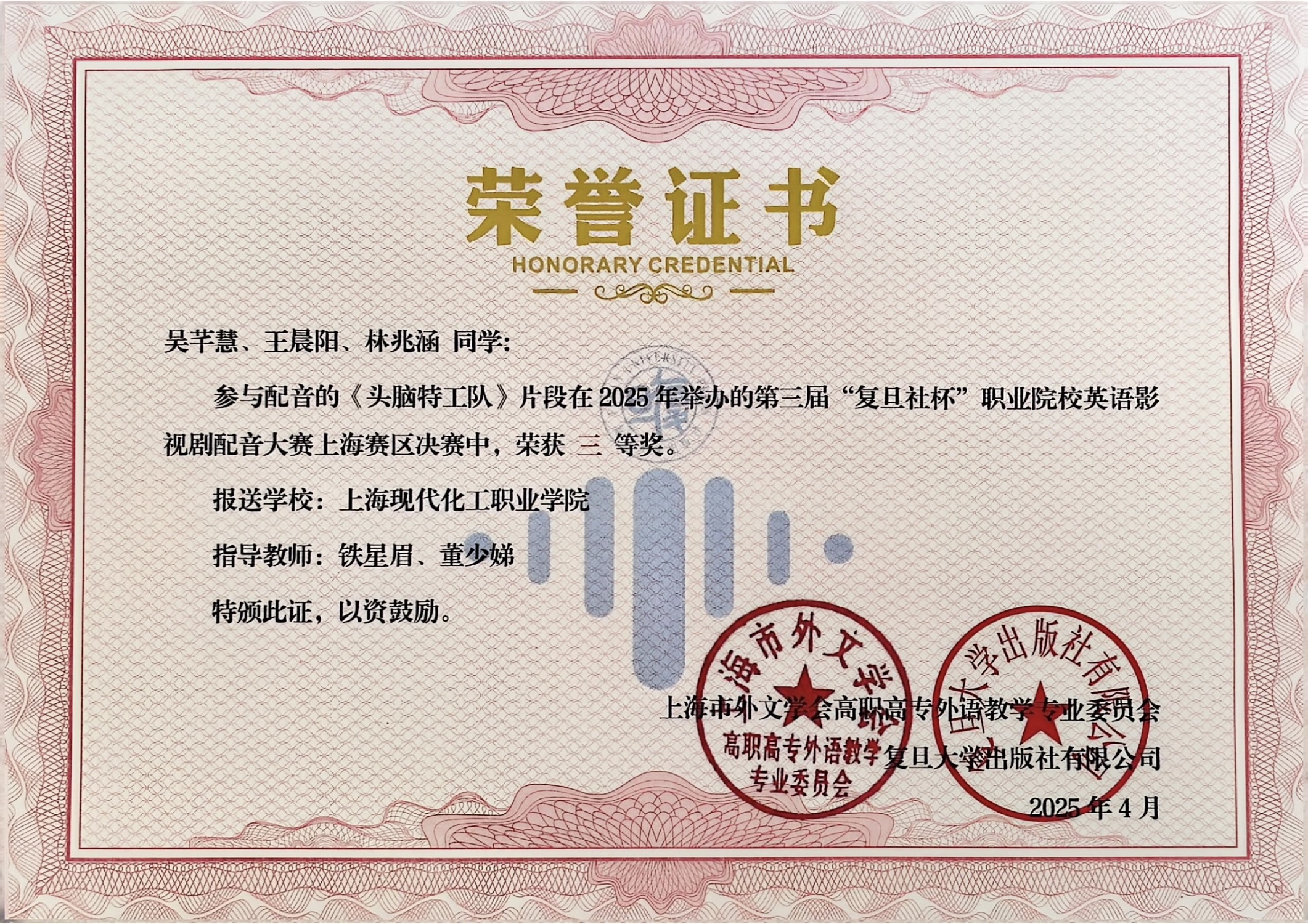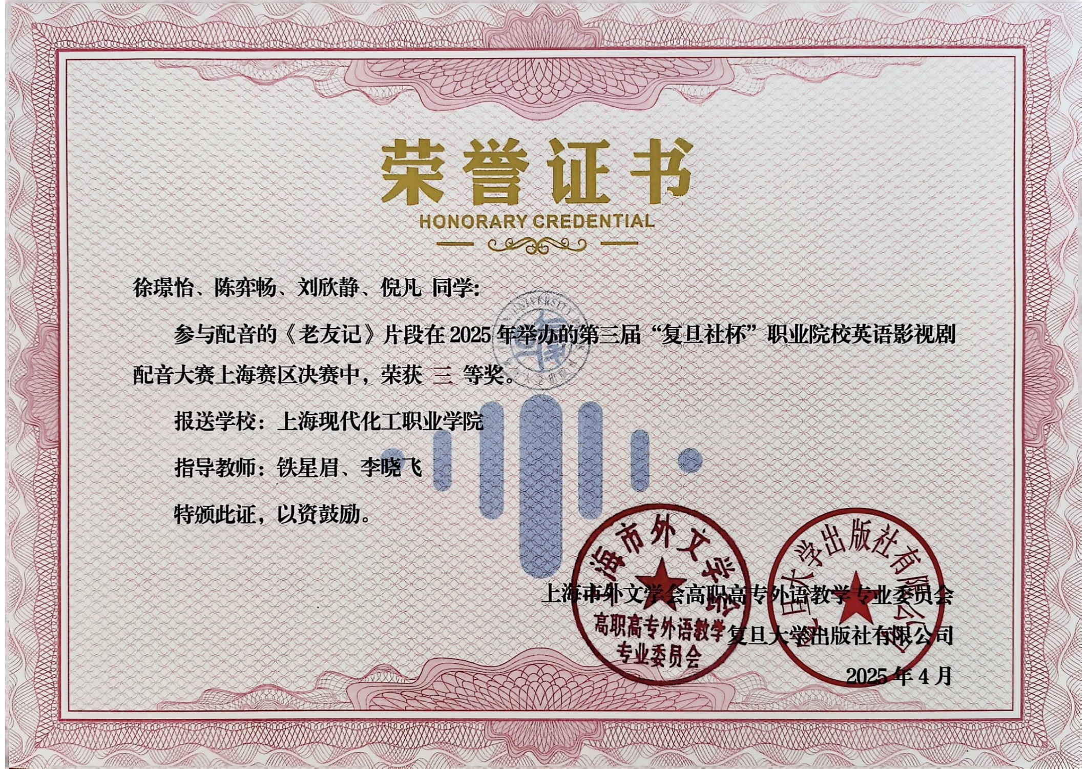 近期喜讯传来,经线上线下两轮比赛,我校推送的两部配音作品在第三届“复旦社杯”职业院校英语影视剧配音比赛上海赛区中均获得三等奖殊荣。