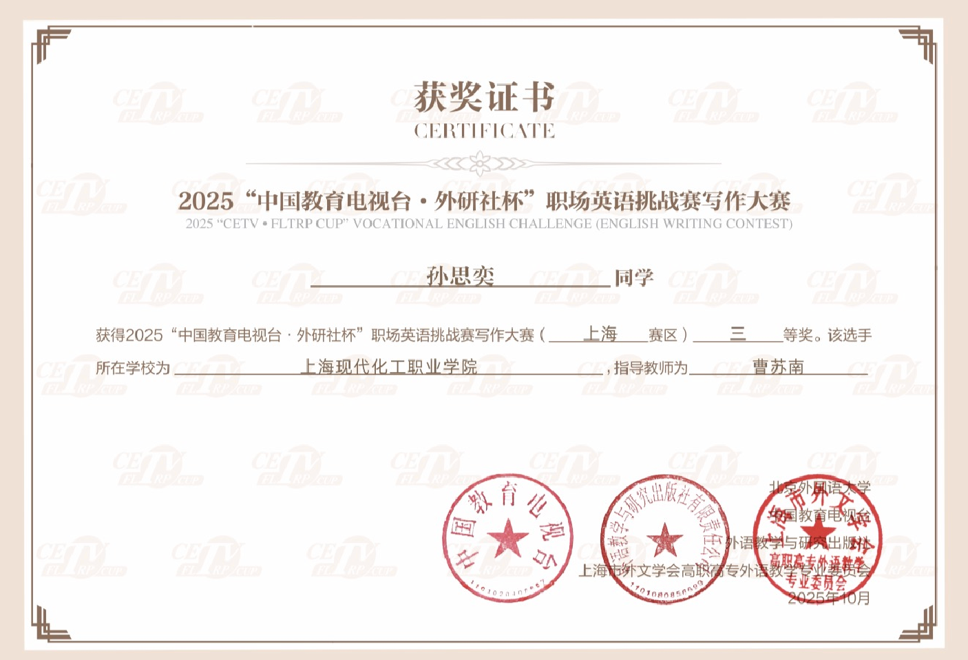 10月26日,2025年“中国教育电视台·外研社杯”职场英语挑战赛写作大赛上海赛区比赛在上海电子信息职业技术学院(闵行校区)如期拉开帷幕。我校精心选派了来自240工业互联网班的吴可情、250分析检验02班的孙思奕以及250新能源材料应用技术班的谢慧珊三位同学参赛。在李晓飞老师和张圣炜老师的悉心指导下,三位同学沉着冷静、全力以赴,顺利完成比赛,充分展现了我校学子积极向上的精神风貌与过硬的英语综合素养。其中,240工业互联网班的吴可情荣获上海赛区二等奖,250分析检验02班的孙思奕获得上海赛区三等奖。