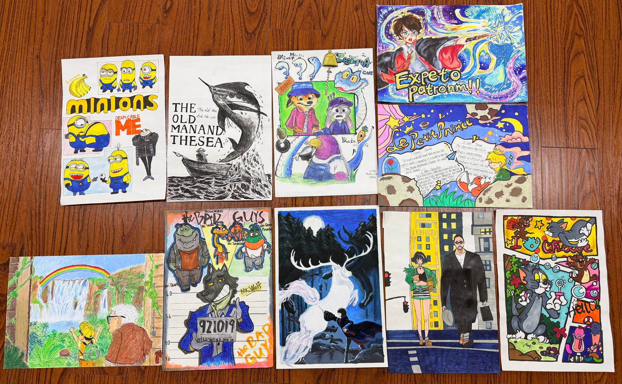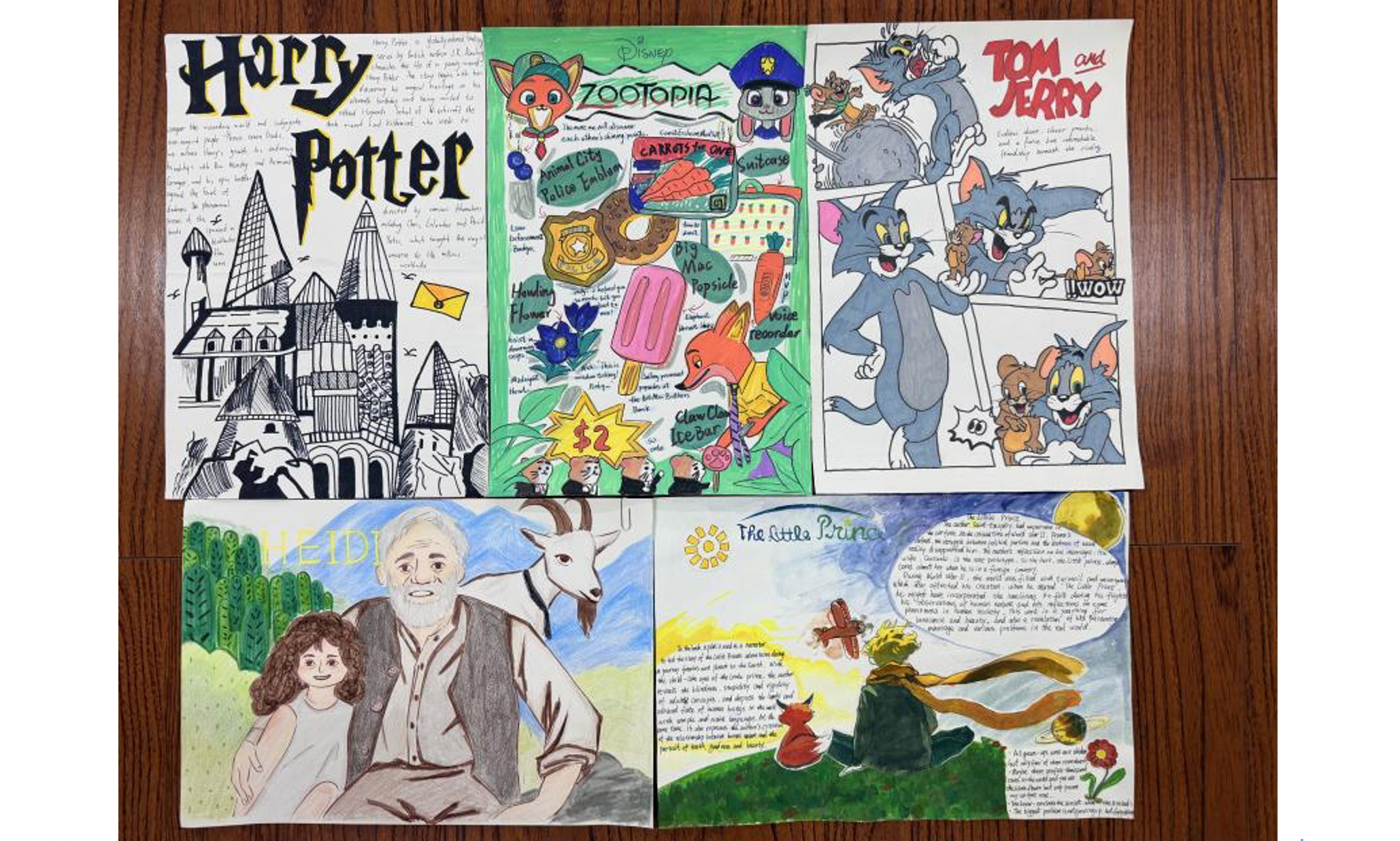 参赛学子围绕《傲慢与偏见》《小王子》《哈利・波特》等经典英文电影或名著,以水彩、素描、油画、漫画等多元形式还原经典场景。每件作品均附带150-200词英文简介,清晰标注场景出处、内容及意义,展现出对经典文化的深度理解与英语应用能力。其中,有的作品以细腻水彩勾勒英伦庄园风情,有的用简洁线条传递童真哲思,还有小组以漫画风格呈现奇幻故事场景,创意十足。
