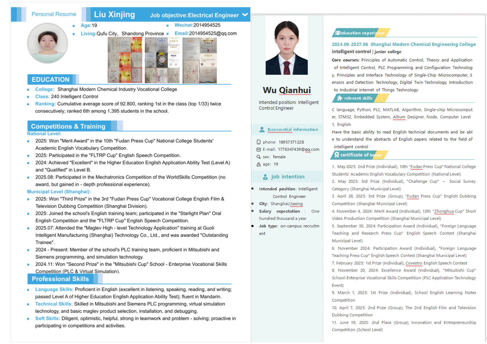 大赛要求参赛者围绕自身所学专业(如应用化工、智能控制、数字化设计等)及明确的目标岗位,独立完成一份全英文个人简历的设计与撰写。同学们提交的作品不仅内容详实,涵盖了个人基本信息、专业技能、实践经历及获奖情况等核心模块,更在格式设计与视觉呈现上展现了丰富的创造力。许多简历巧妙融入了与专业相关的简约设计元素,如化工专业的分子结构图、设计专业的创意版式等,做到了专业性、真实性与美观性的统一。