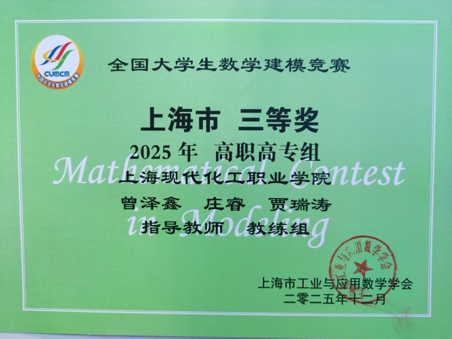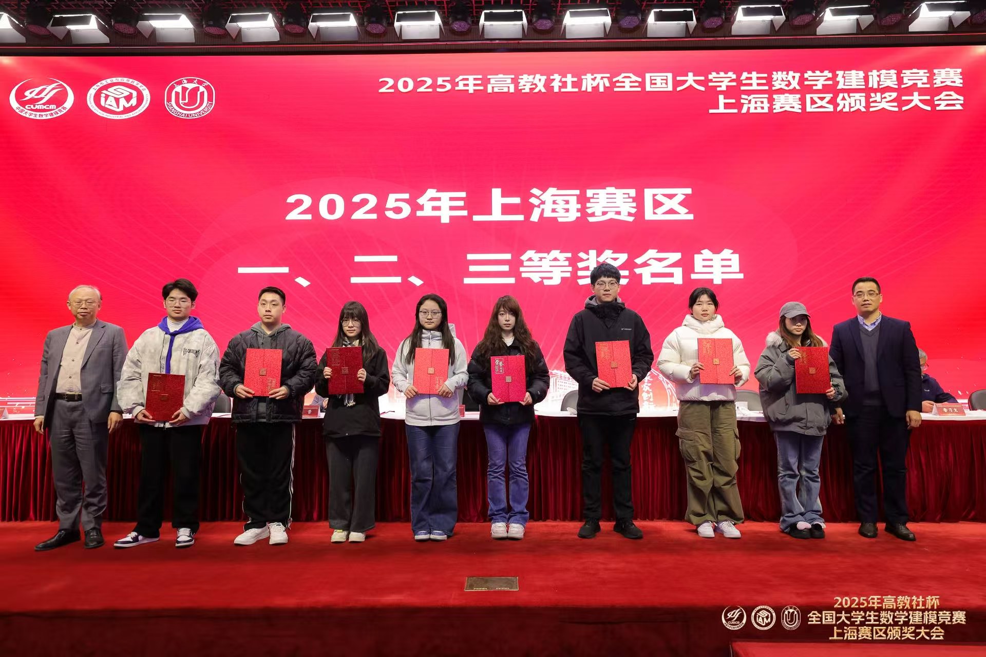 近日,由教育部高等教育司和中国工业与应用数学学会联合主办的2025年“高教社杯”全国大学生数学建模竞赛公布成绩。我校由数学教研室钟韬、陈慧慧、张艳三位老师指导的学生团队贾瑞涛、庄睿、曾泽鑫参赛,获得上海赛区三等奖。12月13日,上海赛区颁奖典礼在上海大学隆重举行,我校钟韬老师带领学生代表前往参会并领奖。