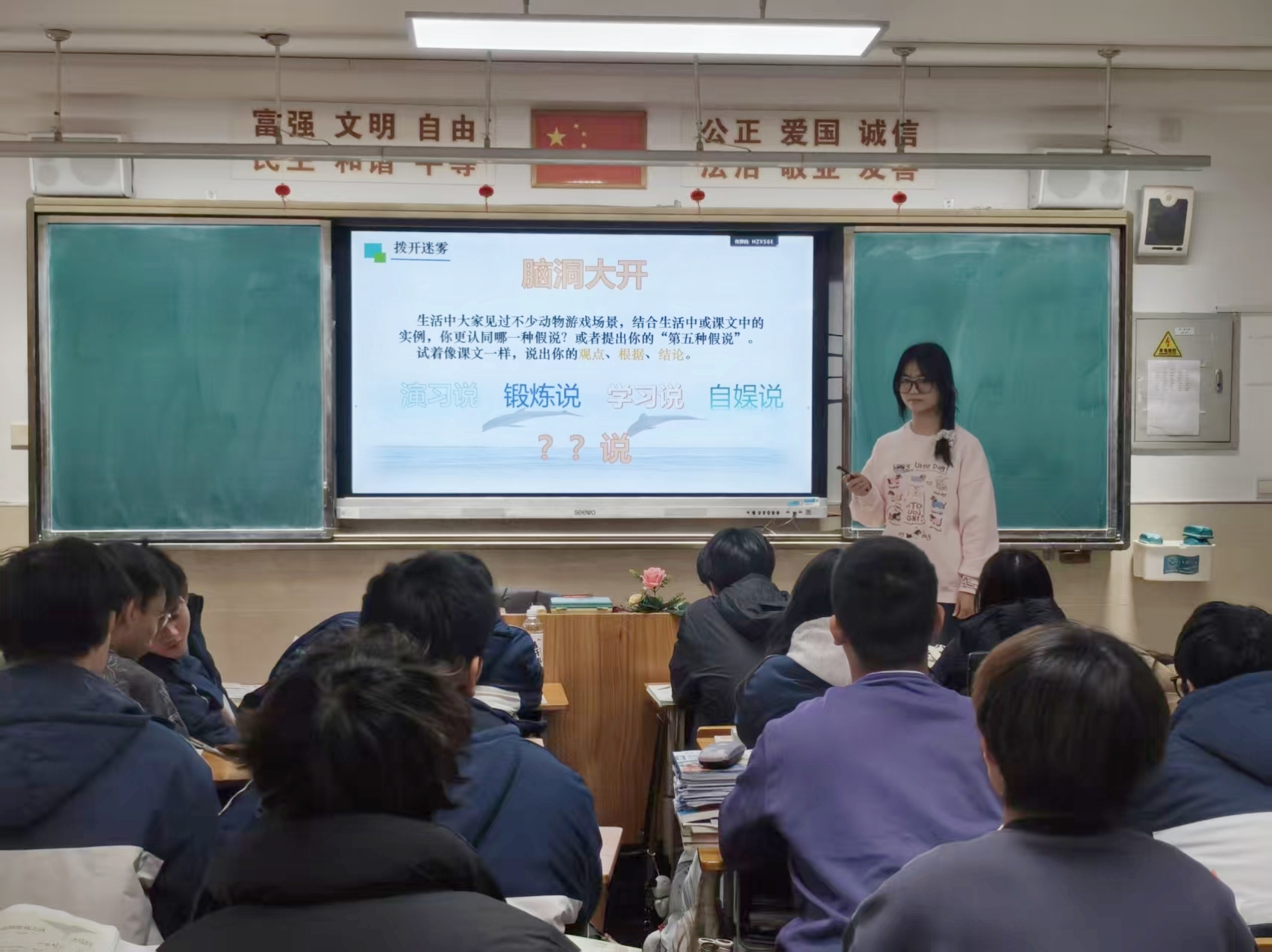 课堂设计层层递进、亮点突出:依托课文文本,张老师先带领学生梳理“尾鳍、羱羊、聒噪”等重点字词,夯实语言基础;再通过默读标注、小组分享的方式,引导学生理清“现象铺垫—分类细化—假说探究—结论升华”的科普文逻辑脉络,让学生掌握科普文“条理清晰、严谨生动”的文体特点。在核心的“四大假说探究”环节,张老师以小组合作填表的形式,让学生自主梳理演习说、自娱说、学习说、锻炼说的依据与结论,并通过“幼狼扑咬”“大熊猫玩轮胎”等案例辨析练习,强化学生对假说核心特征的理解。课堂最后,张老师聚焦“动物游戏之谜未完全解开”的结论,渗透“严谨求实、多元包容”的科学精神,同时结合动物游戏中展现的智能与灵性,引导学生树立“尊重生命、人与自然和谐共生”的生态理念,实现了知识传授与价值引领的有机统一。