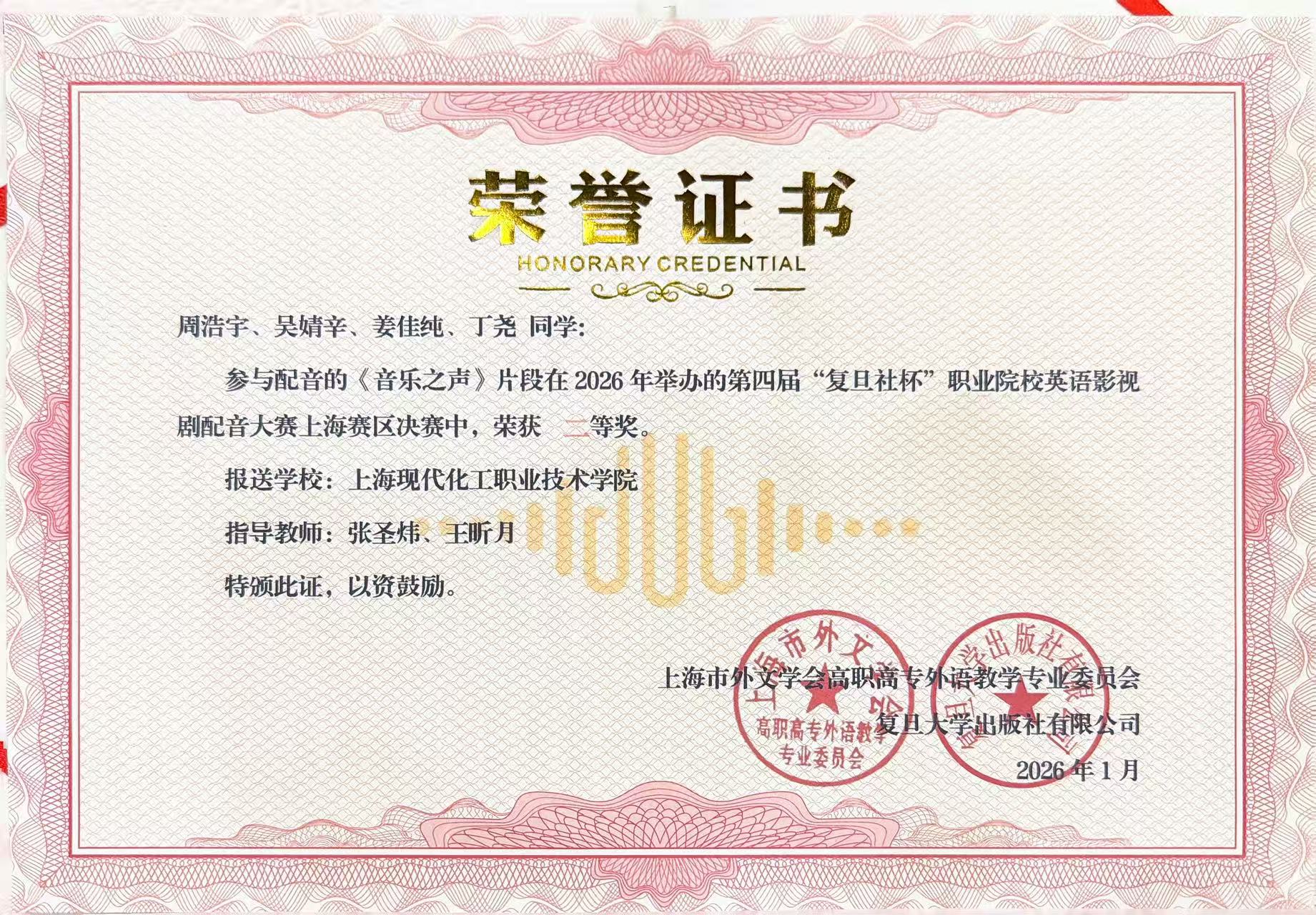 在1月11日落幕的上海市第四届“复旦社杯” 英语配音大赛中,我校“音乐之声” 团队凭借以声传情、以音塑境的精彩表现,从众多参赛团队中脱颖而出,斩获上海赛区二等奖。该团队由张圣炜和王昕月老师担任指导,成员包括250安全管理班周浩宇、250工业互联网2班丁尧、250分析检验2班姜佳纯以及250高分子班吴婧辛。