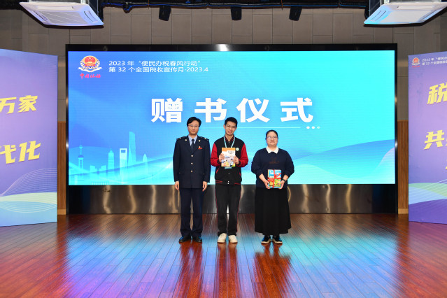 区税务局为学校师生公益赠书,勉励学生加强税法日常学习,助力学生运用所学知识,积极参与税法宣传,争做税法宣传员和税收监督员。