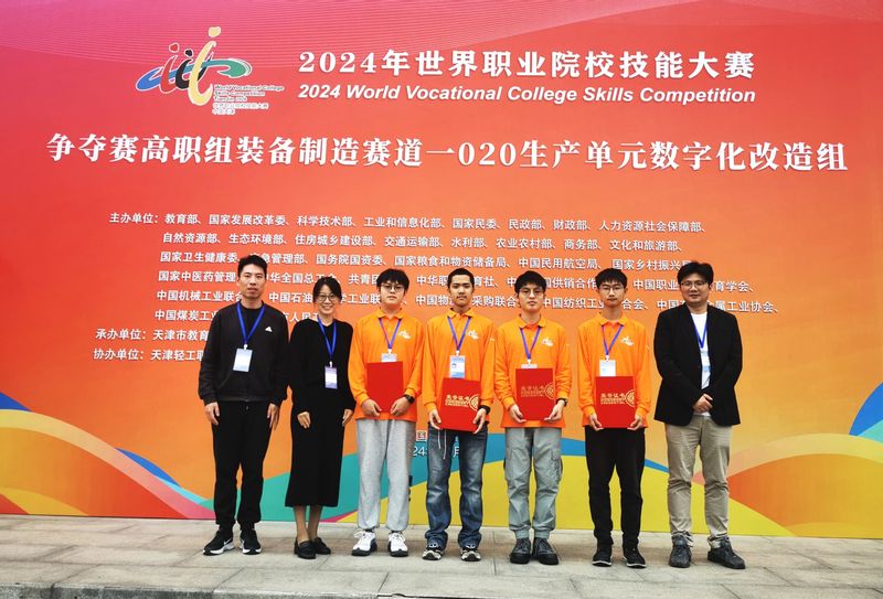 在“生产单元数字化改造”赛项中,智能制造学院在张继皇、孙松等教师的精心指导下,严俊、邵常益、唐嘉辰、范明辉四位同学荣获银奖。