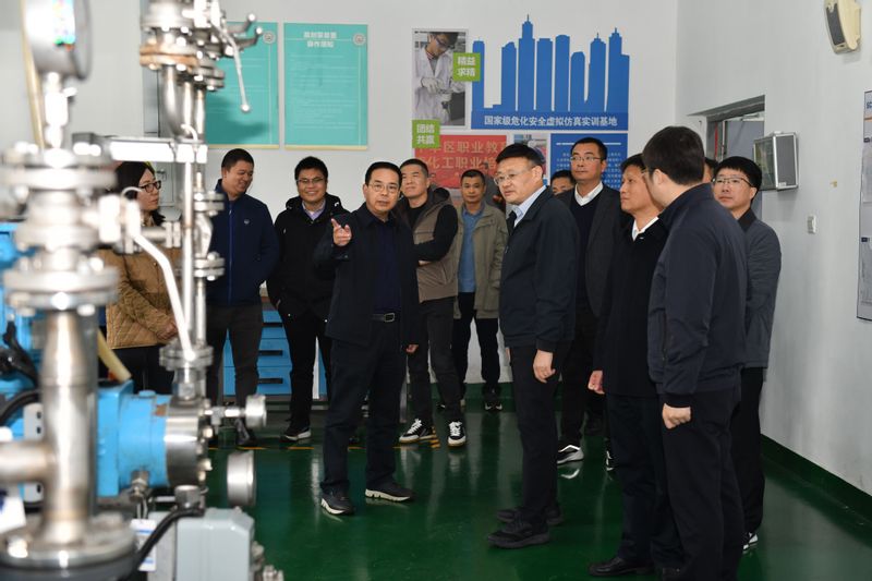 徐荣一行实地参观了学校的全国十佳化工安全实训示范基地。高炬介绍了基地的建设与运行,包括实训设备的功能和使用情况,以及师资队伍、课程设置、实践教学等方面的亮点和成效。考察团成员对实训基地的现代化教学设施、先进的教学理念以及学生在实训中的实践操作能力给予了高度评价。