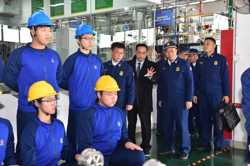 仪式举行前,朱志祥一行在学校党政领导的陪同下,实地调研了学校的化工实训基地和跨企业培训中心,详细了解了实训基地的设施配备、教学模式及化工专业实践教学成果。该实训基地拥有先进的化工模拟设备、专业的操作场地,为化工类消防技能培训提供了得天独厚的条件,其完善的功能与丰富的教学资源得到了领导们的高度认可,也为后续合作筑牢了实践根基。
