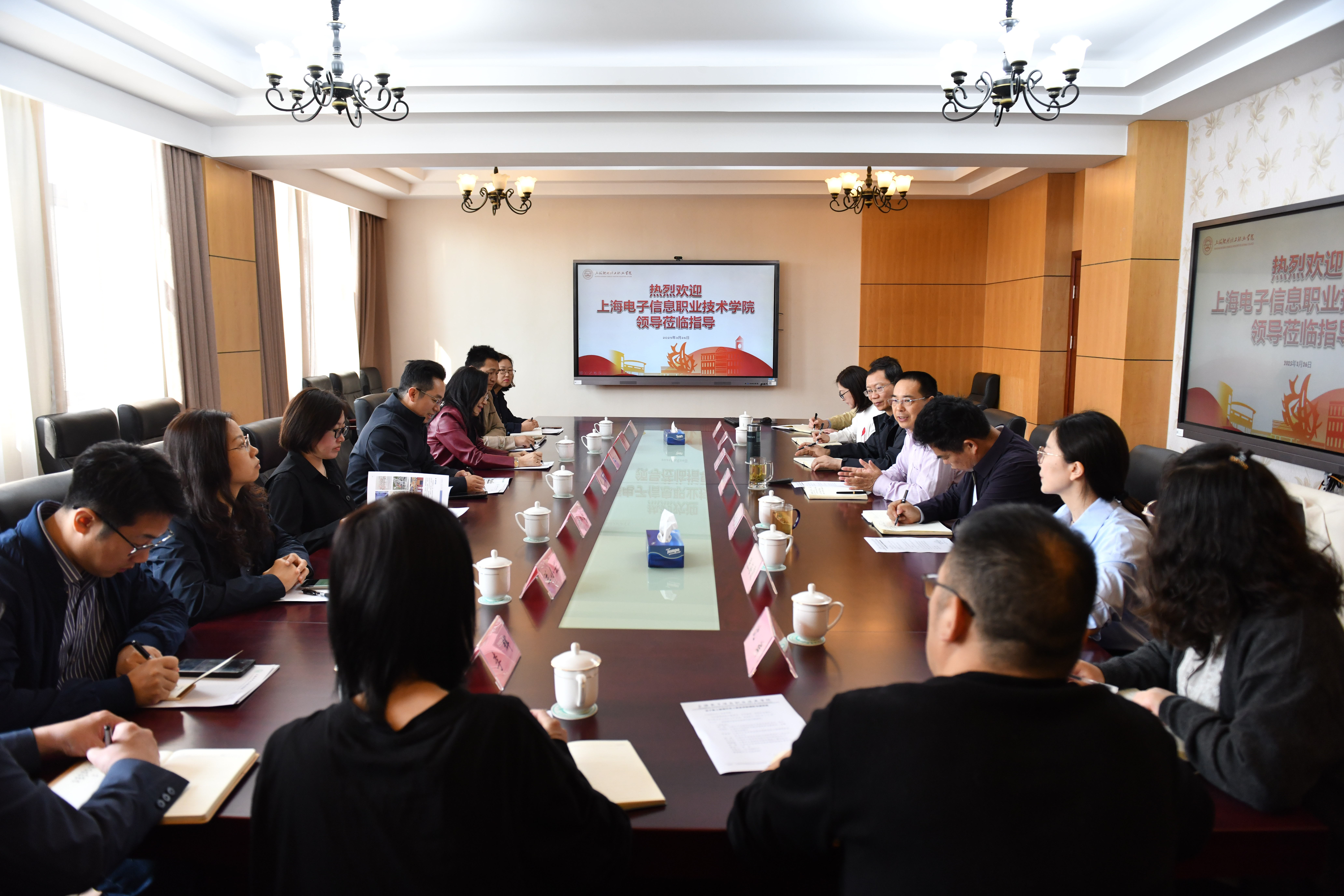 座谈交流现场气氛热烈且融洽,双方围绕多个核心议题深入交换意见。在产教融合方面,双方分享了与企业共建发展共同体的经验,探讨如何更精准地对接产业需求;专业建设上,聚焦重点专业建设与老旧专业转轨,就人工智能赋能学校发展,培养复合型人才的路径展开讨论;在师资队伍建设领域,双方就师资规范管理、教师能力提升等方面的经验进行交流;技术服务领域,探讨组建专业科研团队承接纵横向课题,搭建多样化平台助力中小企业创新转型的方案。此外,双方还就专项师能提升、制度建设互鉴、科研项目攻关等具体合作方向达成系列共识。