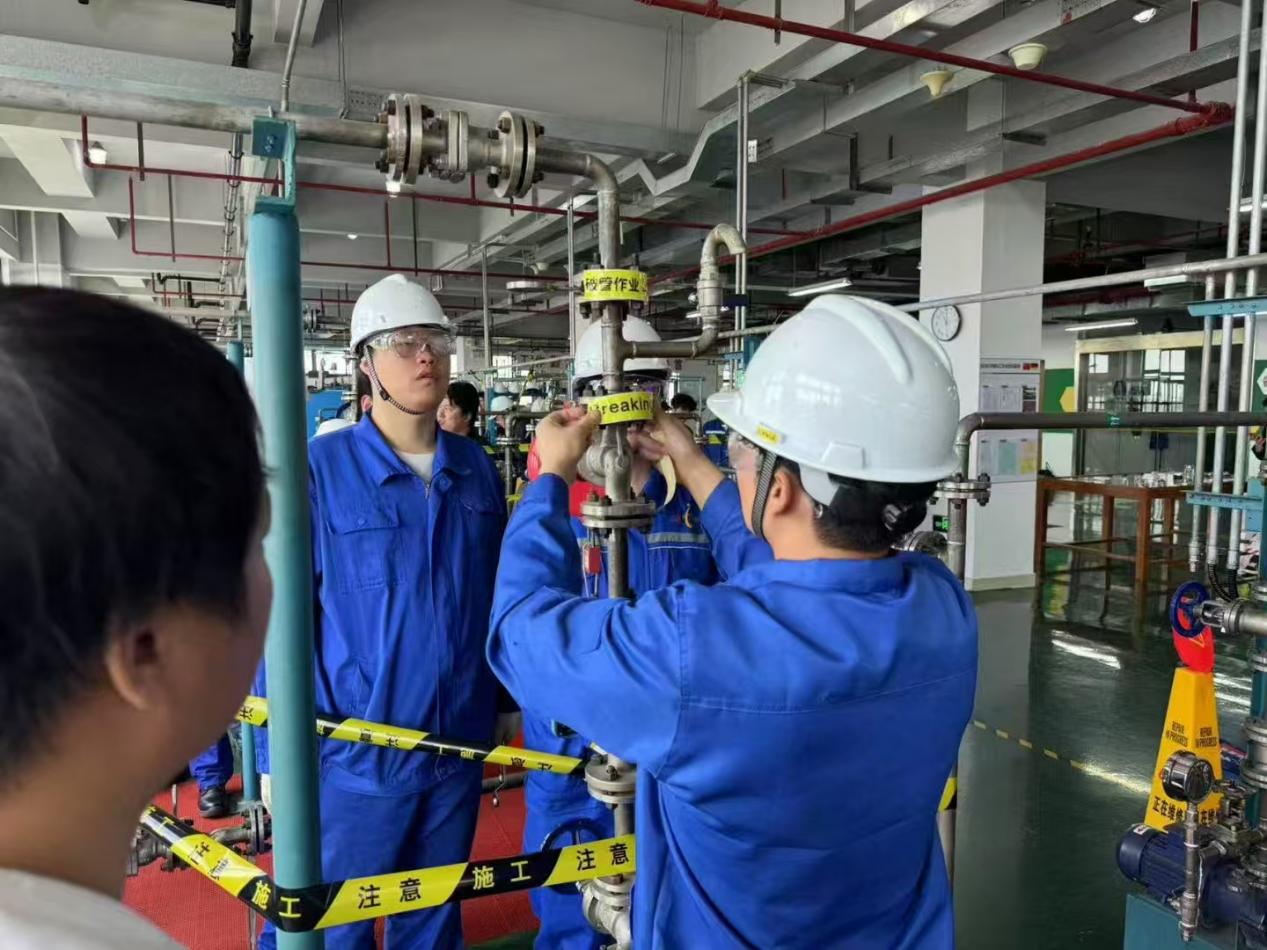 在实操环节中针对管路拆装的实操难点,专家现场演示了多能源隔离、群体作业协作等场景下的LOTO实施步骤,学生们根据企业专家的指导对课程内容进行了实操。
