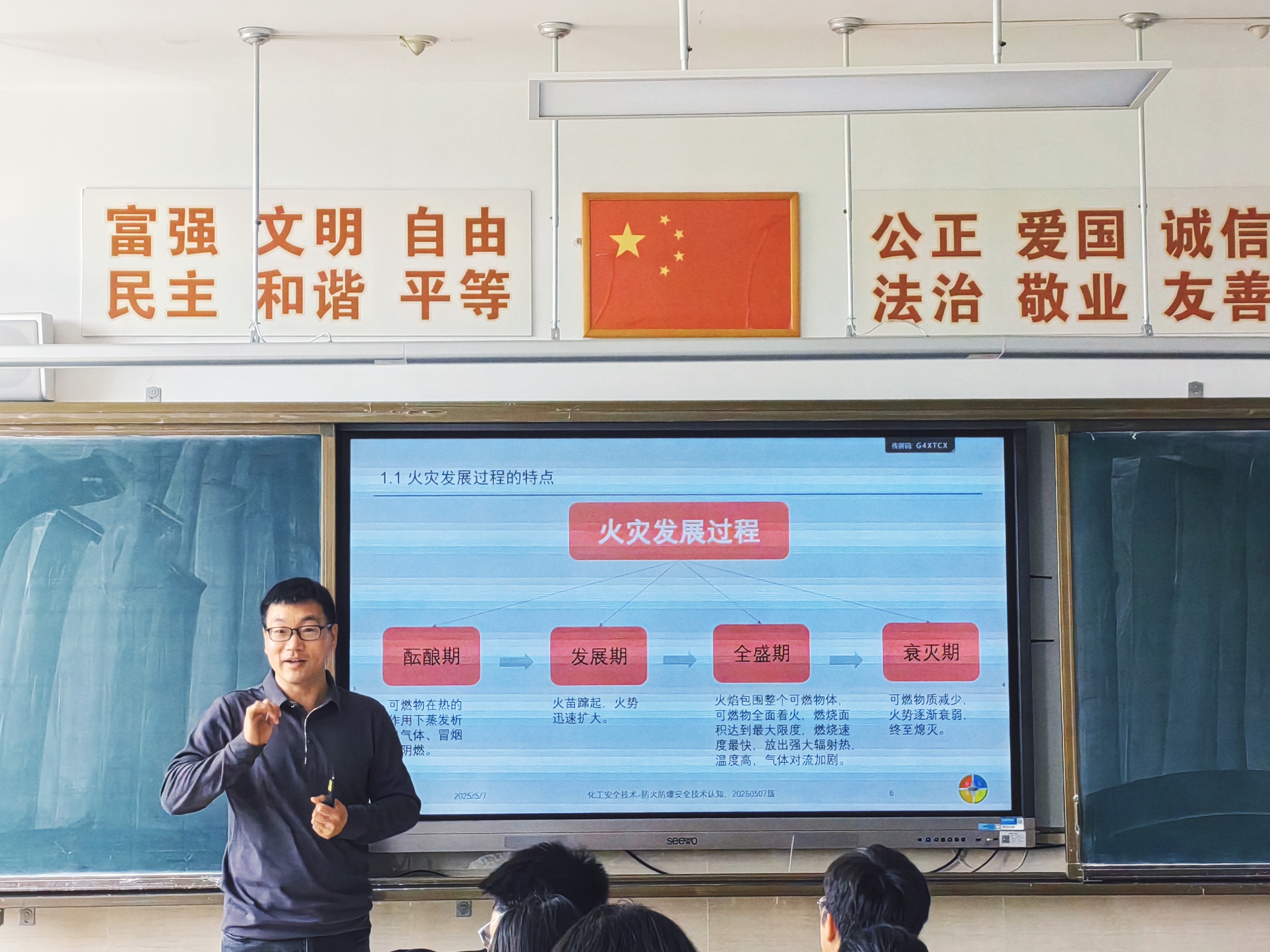 课堂上,黄从会以其精湛的专业知识和丰富的实践经验,为同学们展示了实际企业中防火防爆技术的典型案例,并详细讲解了火灾爆炸过程和预防控制措施、工艺参数的控制措施、防火防爆安全装置等内容。专家不仅深入浅出地阐述了理论知识,还结合实际案例,生动形象地展示了安全阀、爆破片、阻火器等防火防爆安全装置在企业实际运营中的应用。同学们全神贯注地聆听,积极参与互动,课堂学习氛围浓厚。