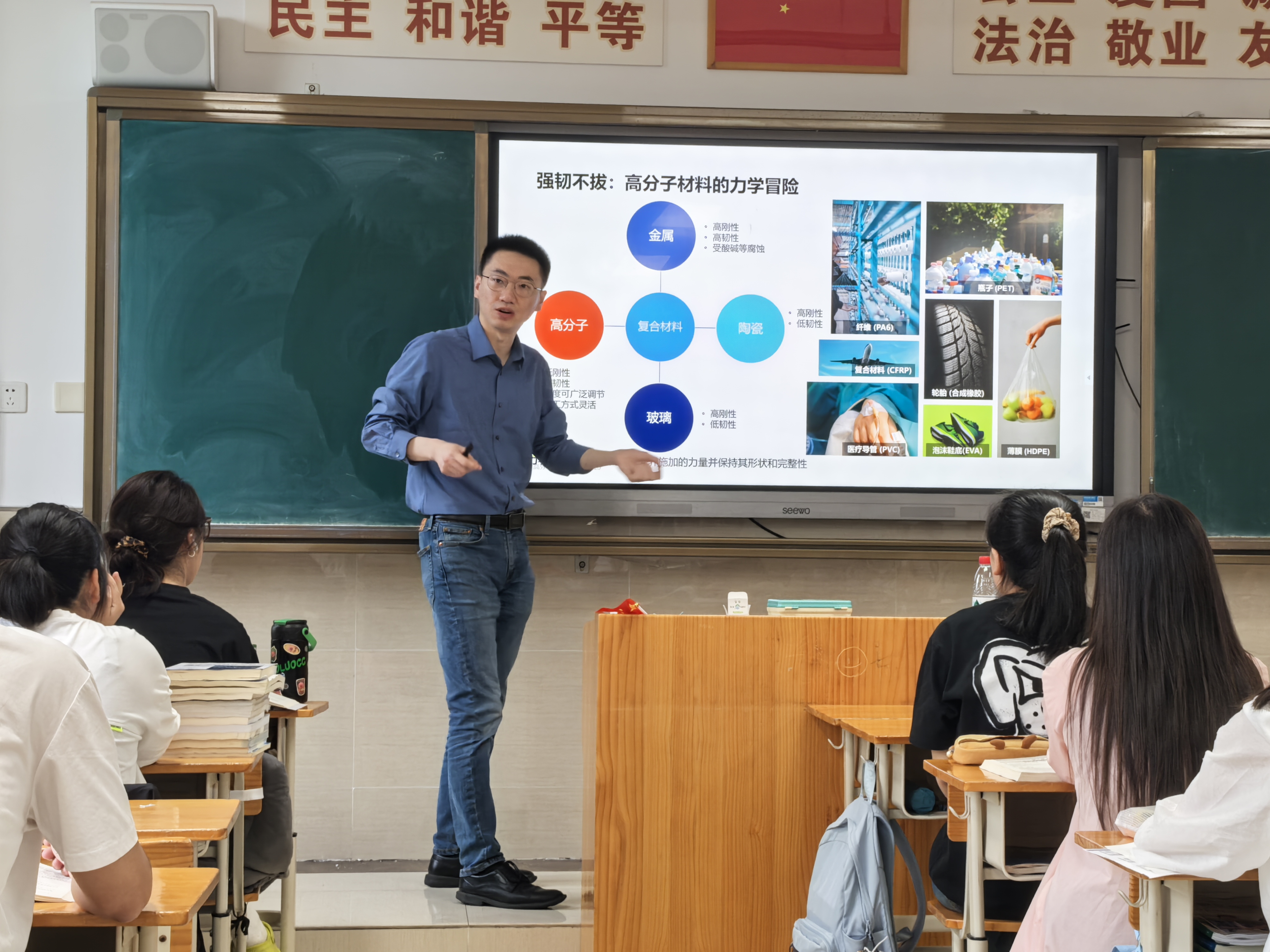 课堂上,滕飞首先通过高分子材料的力学性能的影响因素入手,结合不同学科的交叉和融合引入课题,也让同学们意识到高分子材料的聚合反应不单单是一个独立学科,应多角度、多课程共同学习。接着,他详细讲解了逐步聚合的发现、聚合模型推导、逐步聚合与连锁聚合区别、逐步聚合反应实例等内容,让学生们从理论结合实践的角度更深入的学习逐步聚合反应相关内容。