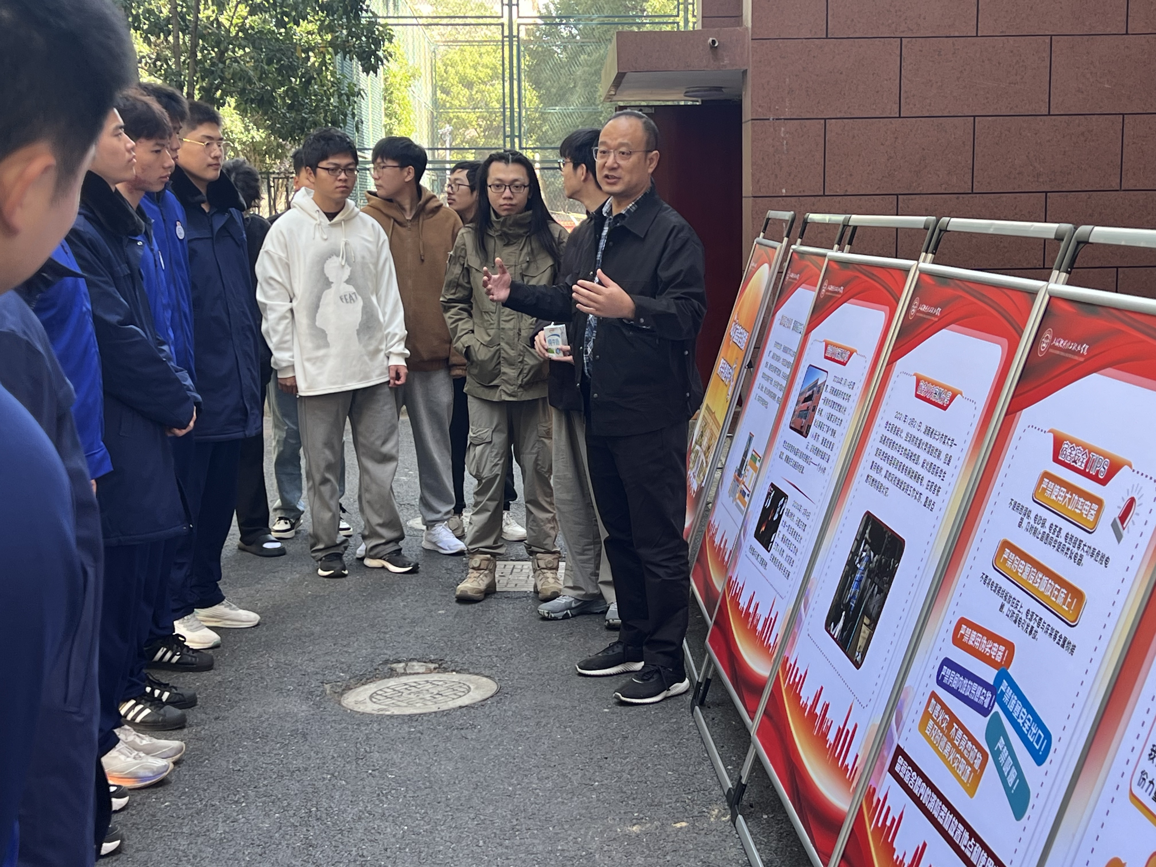 后勤保障处副主任赵东晓现场为同学们讲解,提醒大家“安全无小事,防患于未‘燃’”,并结合展板中“宿舍火灾案例分享”板块,以近期某高校因使用违规电器导致火情的真实案例作警示,告诫同学们“一人违规、全寝危险”,务必做到“人走断电、易燃远离”,让安全成为宿舍最牢固的“防火墙”。
