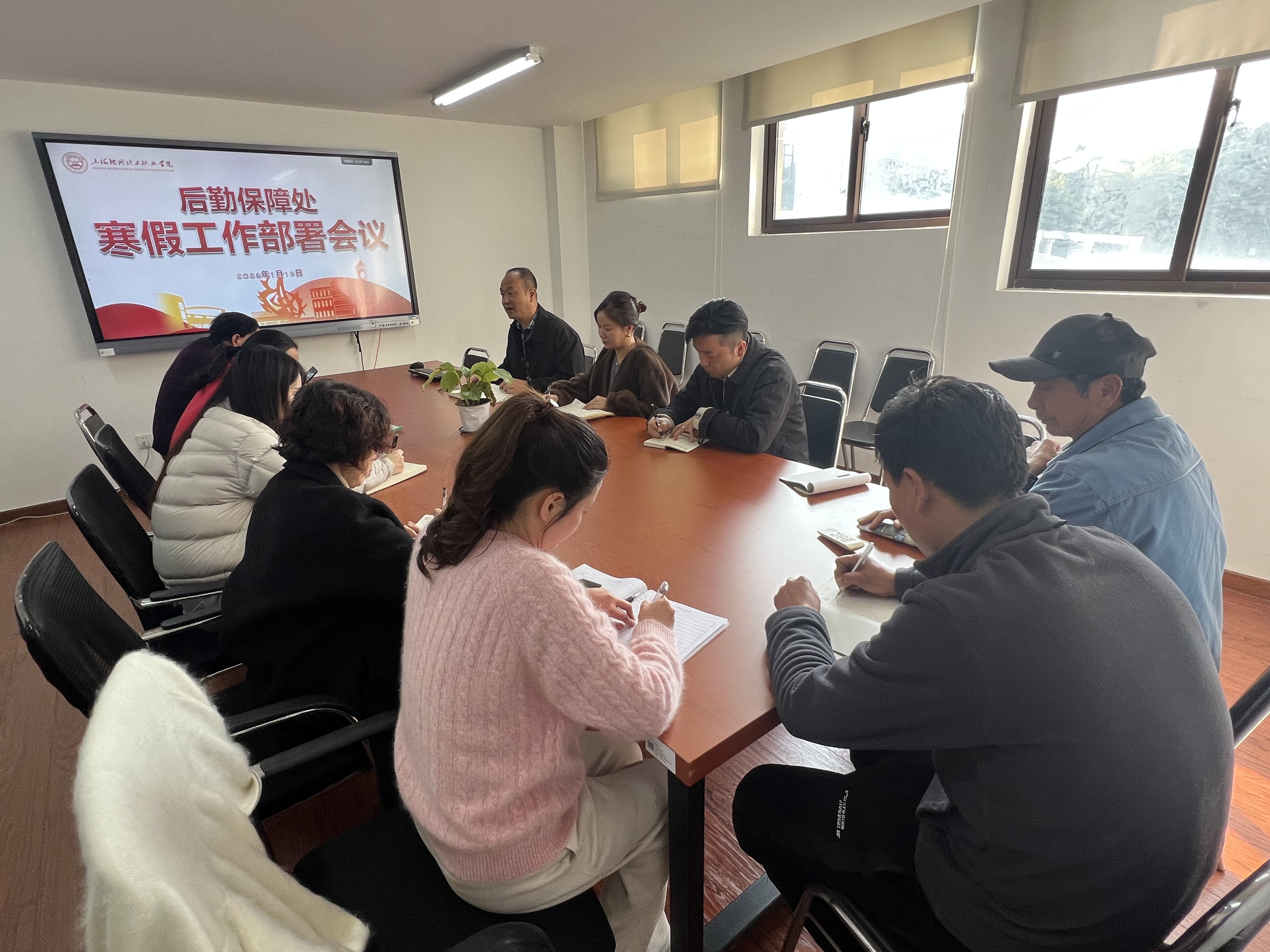 为扎实做好寒假期间校园后勤服务保障与安全稳定工作,确保师生度过一个平安祥和的假期,1月15日下午,后勤保障处在二楼会议室召开2026年度寒假工作部署会。后勤保障处主任蒋方平,食堂、宿舍、保洁、绿化及物业等第三方服务单位负责人参加会议。会议由后勤保障处副主任赵东晓主持。