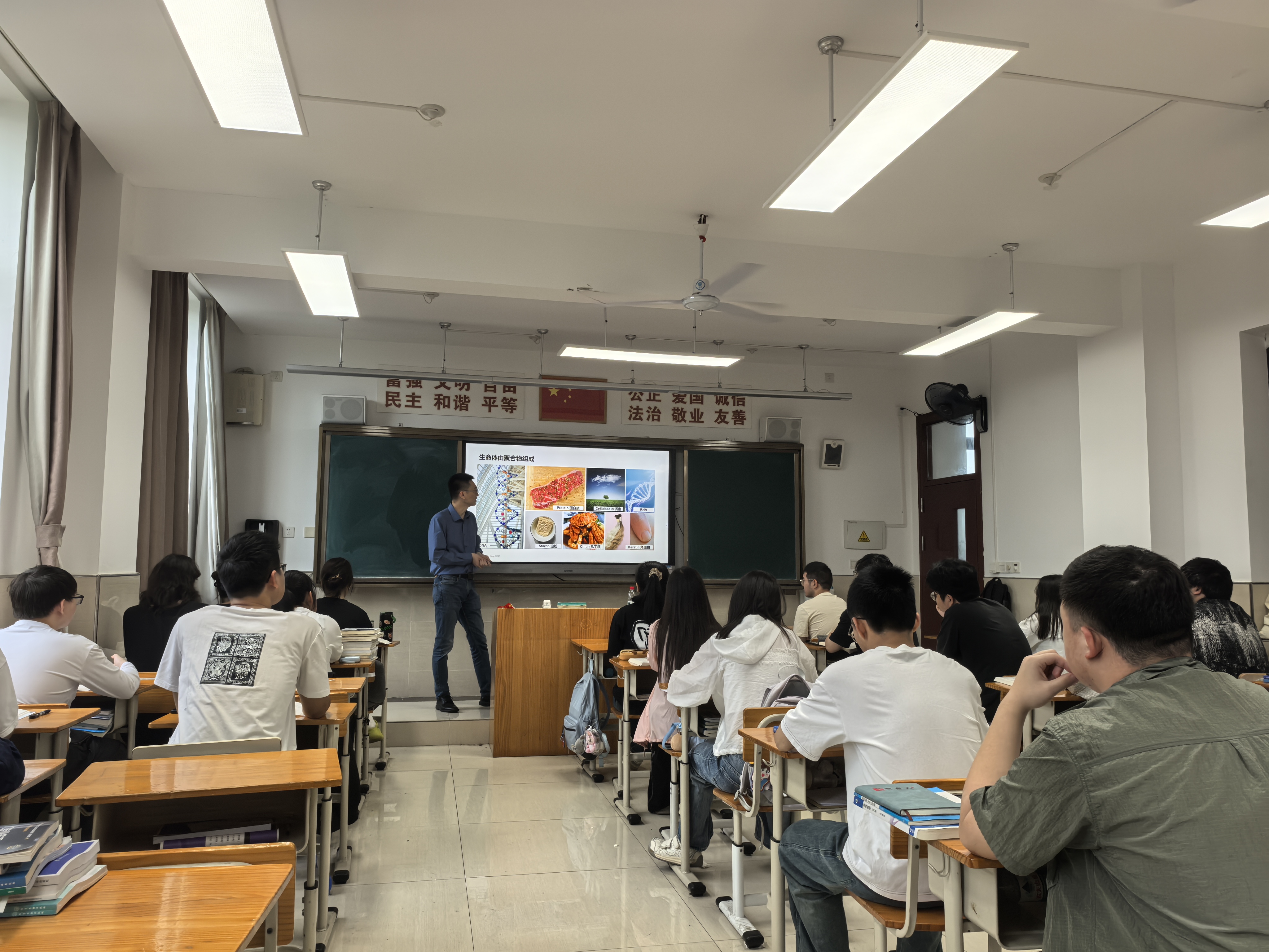 课堂上,滕飞首先通过高分子材料的力学性能的影响因素入手,结合不同学科的交叉和融合引入课题,也让同学们意识到高分子材料的聚合反应不单单是一个独立学科,应多角度、多课程共同学习。接着,他详细讲解了逐步聚合的发现、聚合模型推导、逐步聚合与连锁聚合区别、逐步聚合反应实例等内容,让学生们从理论结合实践的角度更深入的学习逐步聚合反应相关内容。