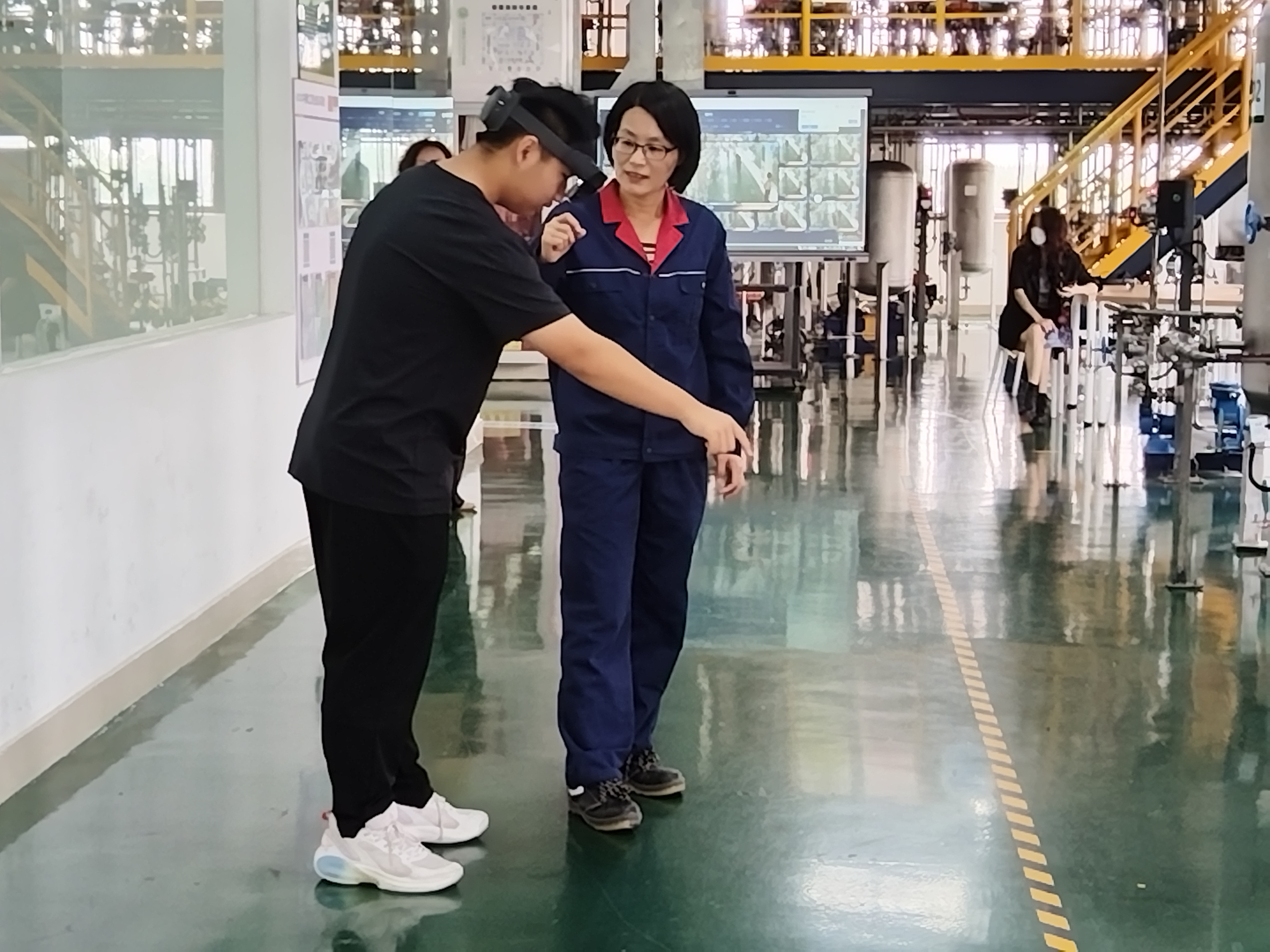 “你遇见了未来的自己,你喜欢化工还是喜欢科技?”在碳二加氢中试实训装置,同学们感受到了化工和科技的碰撞。MR眼镜让同学们拥有了一双透视眼,他们看到了反应器内物料在进行化学反应,他们看到了换热器内冷热流体在进行热交换,他们看到了精馏塔内流体传热和传质过程。MR眼镜手势互动让同学们体验了离心泵开车操作和初期火灾应急措施,这种身临其境的化工认知让同学们直呼神奇。现场不断响起的“您未规范佩戴安全帽”也时刻提醒着同学们从事一份职业必须要有的安全意识和职业规范。