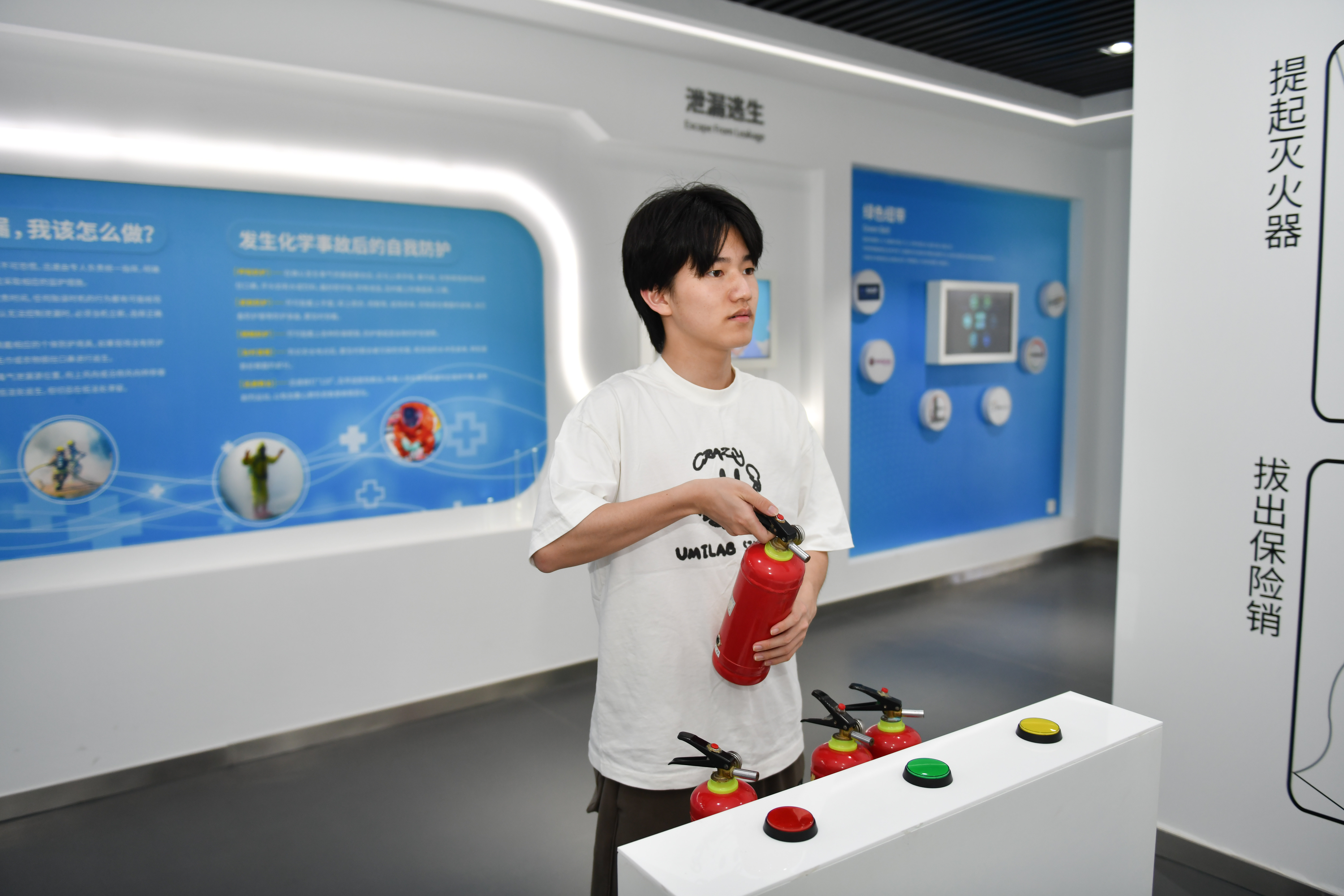 科普馆以“探秘绿色化工”为主题,设置三大展区,涵盖化学发展史、物质世界奥秘、化工与社会进步等内容。在“元素的起源”视频展区,学生们通过宇宙大爆炸的视角,了解元素周期表的形成;元素实物展柜与互动触屏则直观展示了分子反应的本质。此外,虚拟灭火体验、PPE穿戴VR等实践项目深受欢迎,学生们在游戏中掌握了安全防护与应急技能。展馆还特别呈现了化工在国防科技、绿色环保等领域的应用,如冬奥火炬材料、抗腐蚀涂料等,凸显化工技术对现代生活的深远影响。