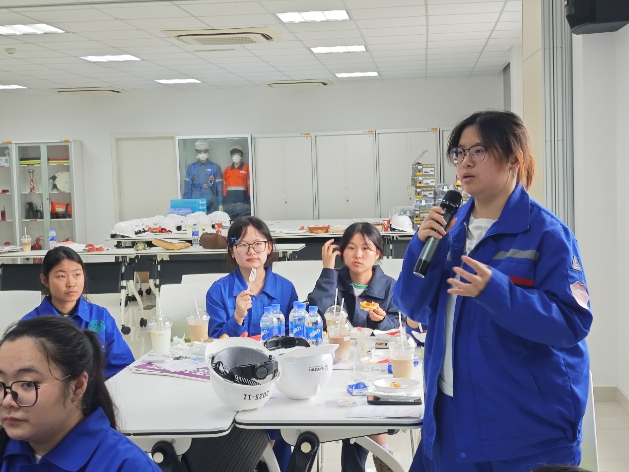 师生们首先接受了安全培训,随后通过暖场破冰和“五感贴纸”分组活动迅速融入氛围。赢创基地总经理陈书峰热情欢迎师生,强调行业创新潜力及对多元化、专业化人才的渴求,特别鼓励女生勇敢探索职业舞台、共同感受化工行业的魅力。