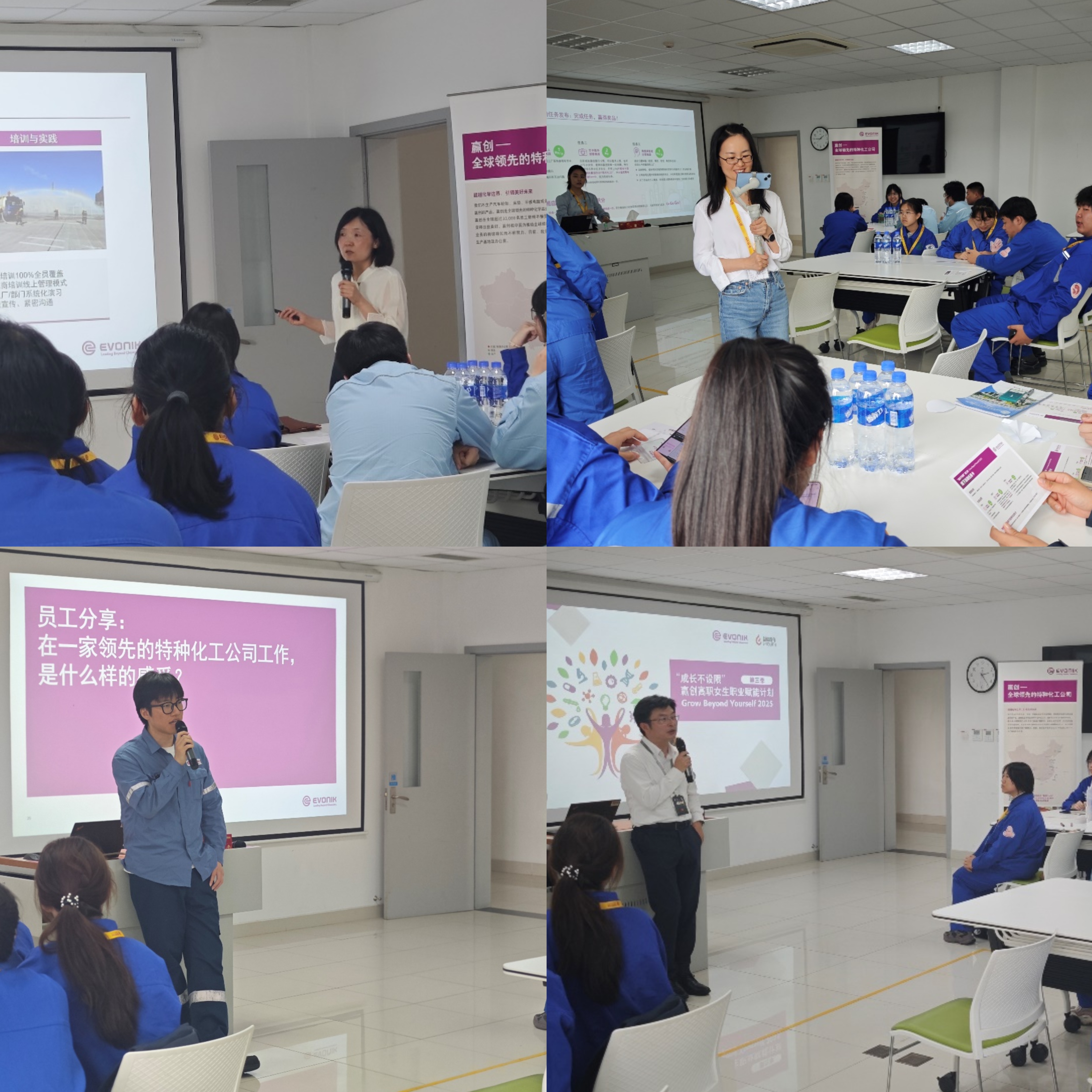 应用工程部经理汪玲介绍了赢创的全球布局、技术理念及核心业务,益优青年代表朱彦则详述了“成长不设限”项目的赋能宗旨。学院优秀毕业生、现赢创员工朱晓杰分享了其职场成长经历,为学弟学妹提供了宝贵借鉴。随后,师生们跟随工程师深入生产控制室、装置现场及分析实验室,在专业讲解中近距离感受现代化工生产的智能与严谨,并在真实的生产环境中完成了趣味拍照打卡任务。 活动尾声的茶话会上,学生们围绕参观中的“五感”体验积极分享交流,活动在表彰优胜团队及全体大合影中圆满结束。