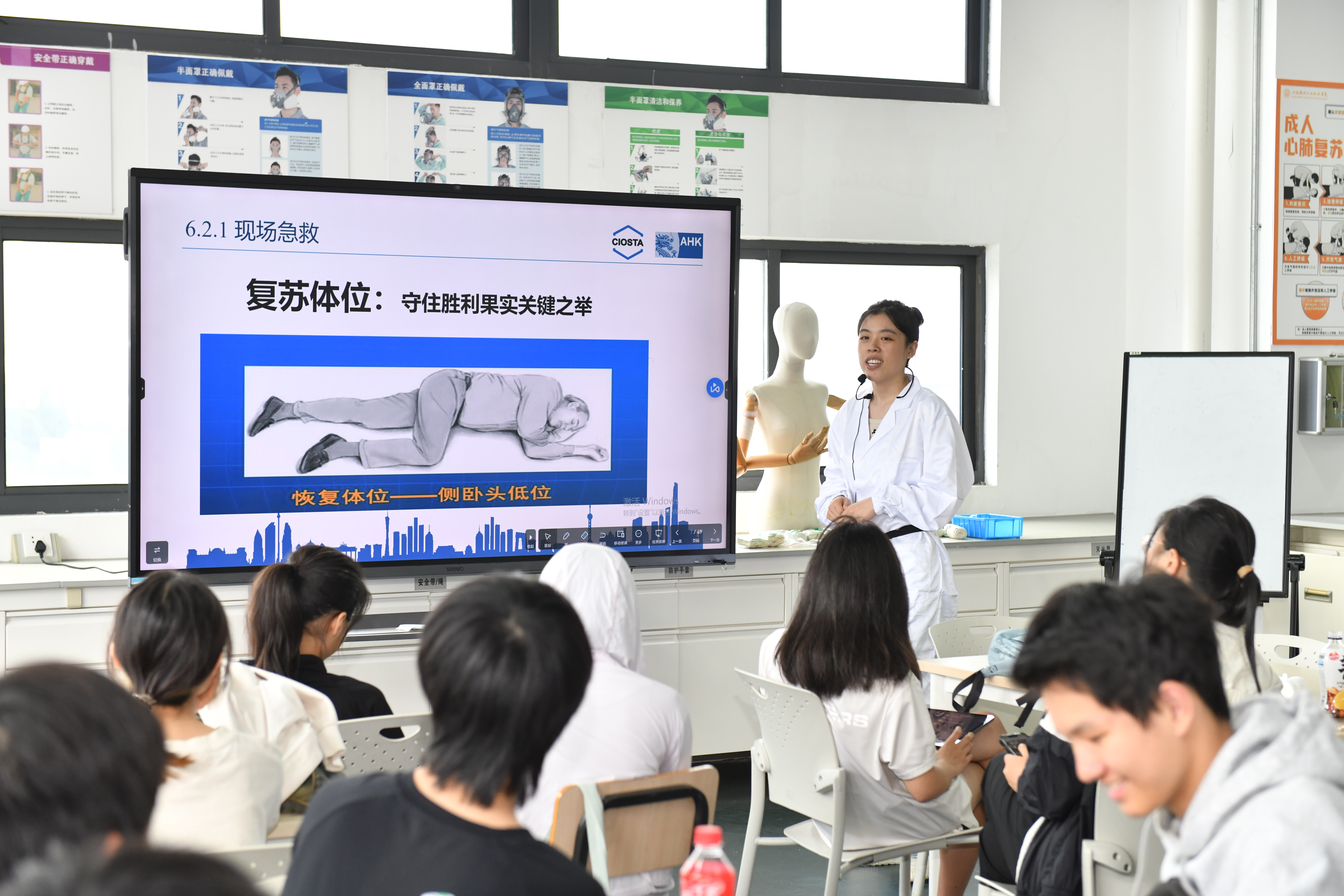 在各实训模块中,安全教育始终贯穿全程。现场急救技术实训室里,老师详细讲解止血包扎、灭火器使用等操作的安全要点后,学生们分组进行单人徒手心肺复苏术实训。当同学完成标准操作获得满分时,教室中爆发出热烈的掌声与欢呼。