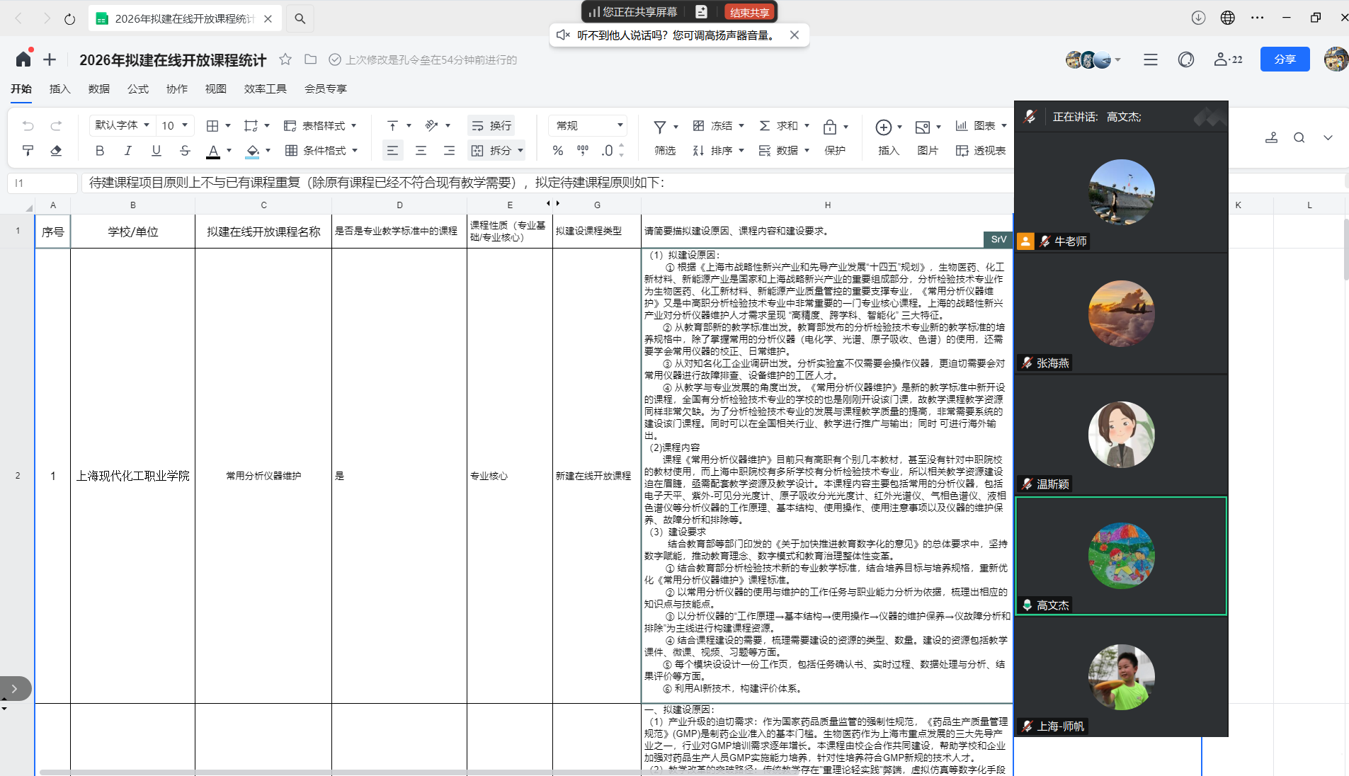 有意向申报在线开放课程的上海现代化工职业学院、上海市医药学校、上海信息技术学校、上海科技管理学校、上海食品科技学校等五所学校根据上海市教委课程建设的总体原则,分别从拟建设原因、建设内容、建设要求、建设思路、建设特色等角度进行申报陈述。