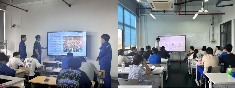 周五的实践在总结与展示中收尾。上午的安全用具操作实训中,学生们逐一演练防护用具的穿戴与使用,确保熟练掌握应急防护技能;高分子材料实训区,大家通过样品观察、简易实验,直观感受材料特性。下午,各班班级教室内的 PPT 汇报成为亮点:每组 4-5 名学生组成的团队,结合五天实践经历,用图文并茂的演示文稿展示实训内容、操作心得与问题解决方案,8-10 分钟的汇报里,既有对精馏操作的细节复盘,也有对团队协作的感悟分享,赢得现场师生的阵阵掌声。