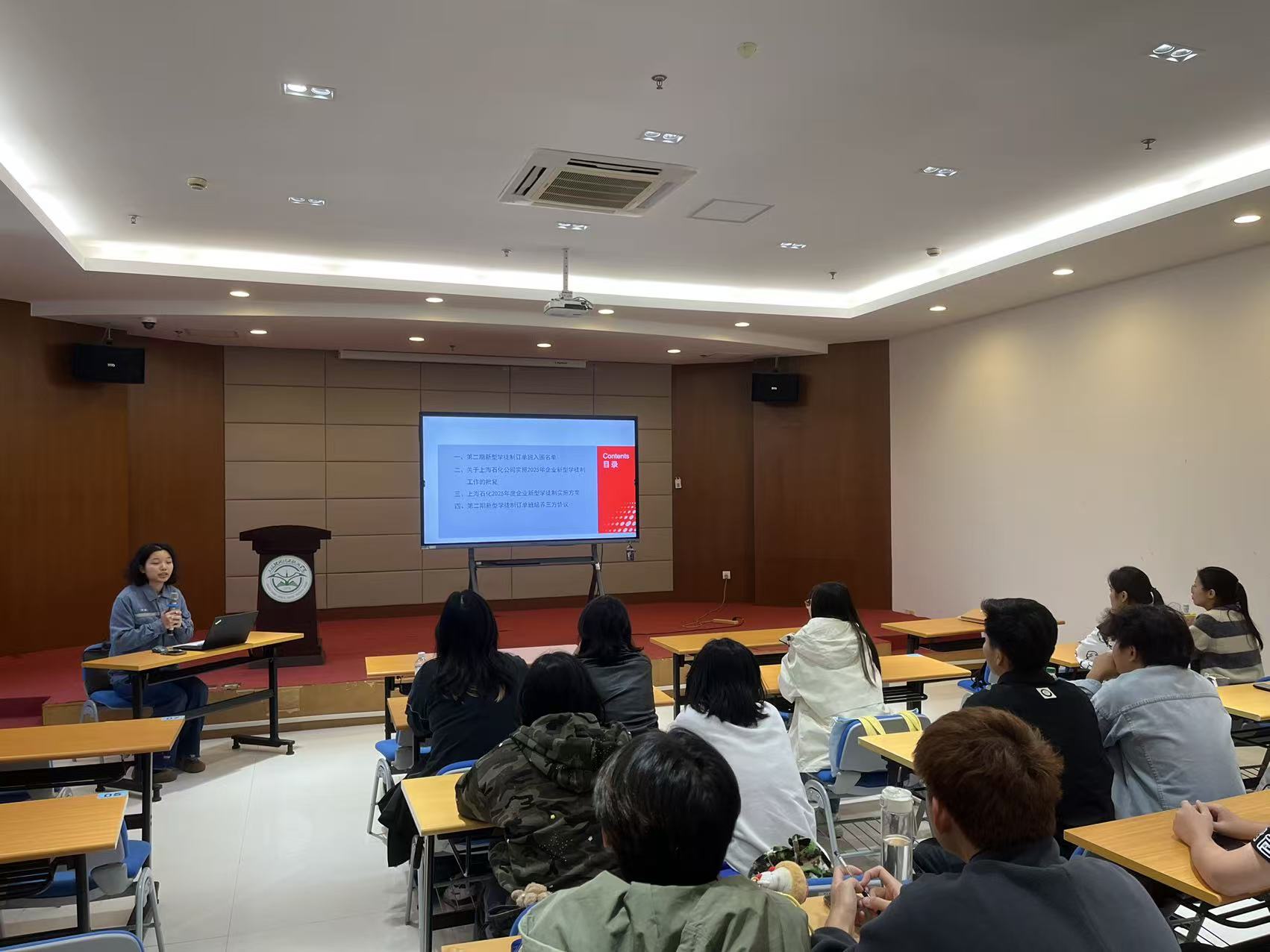 10月29日下午,上海石化人力资源部的老师来校给2025年上海石化冠名班的34位同学开展一次组班说明会,介绍了此次组班的背景、后续的学习实习安排、考核要求和关于签订三方实习协议中各项条款的说明。