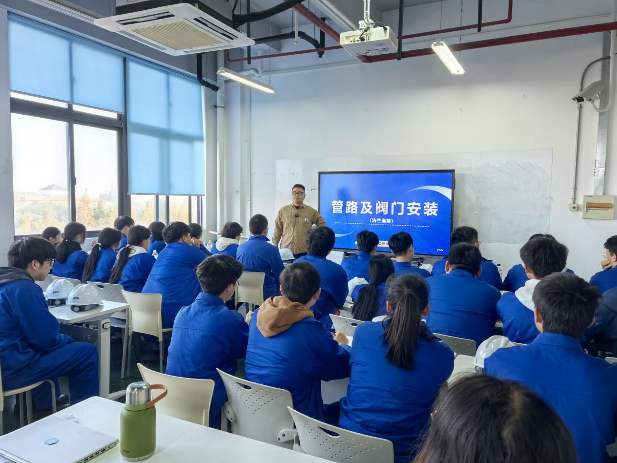 为深化校企合作,提升学生专业实践技能,11月14日,化学工程学院开展“管道及阀门安装(法兰连接)”专题公开课。本次课程由企业专家俞亮主讲,化学工程学院231应用化工02班全体学生及多位专业教师共同参与。