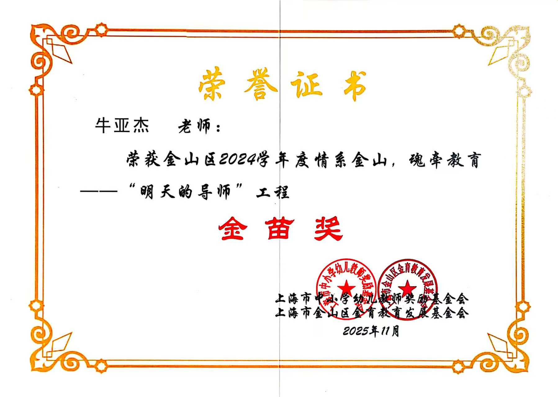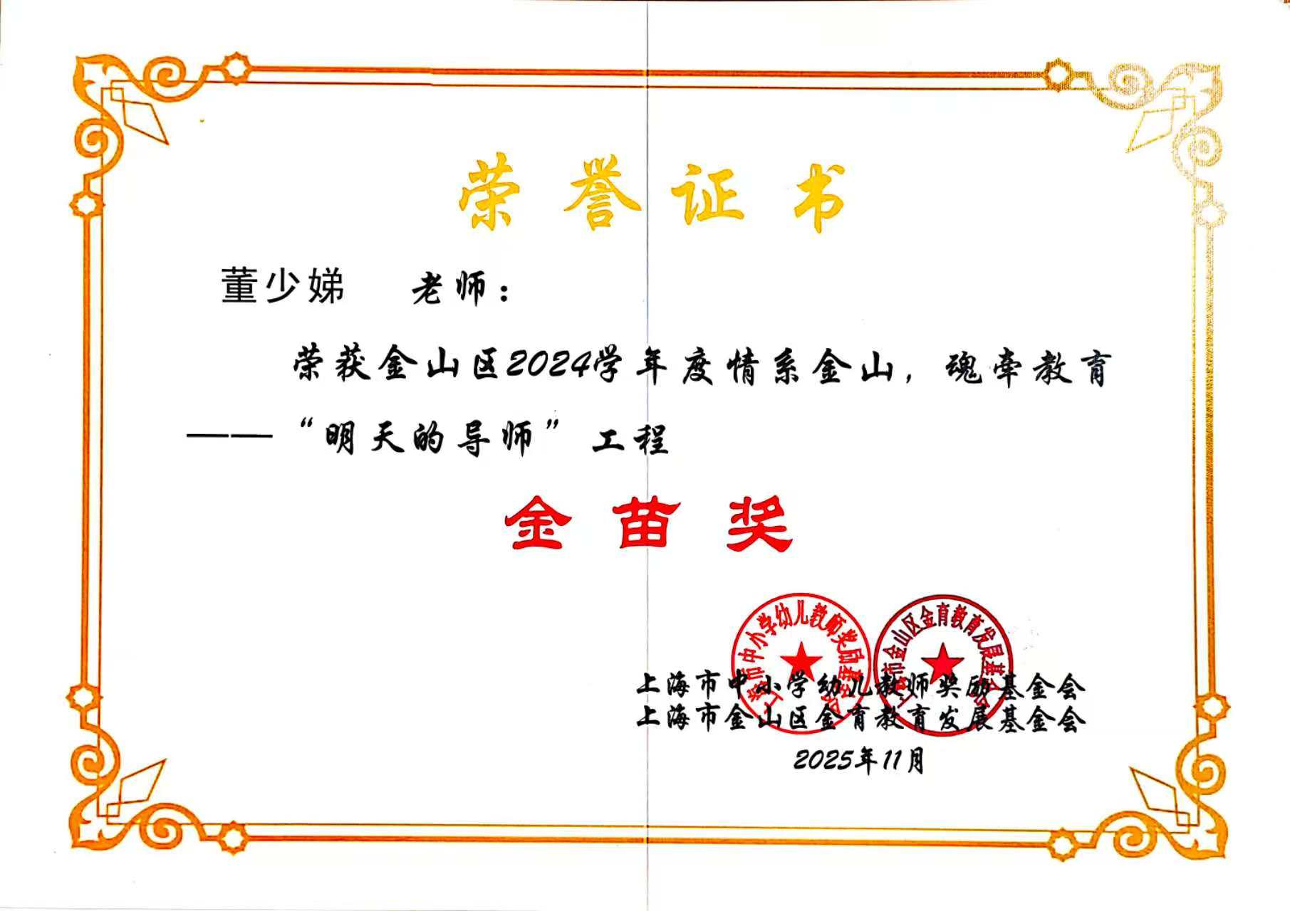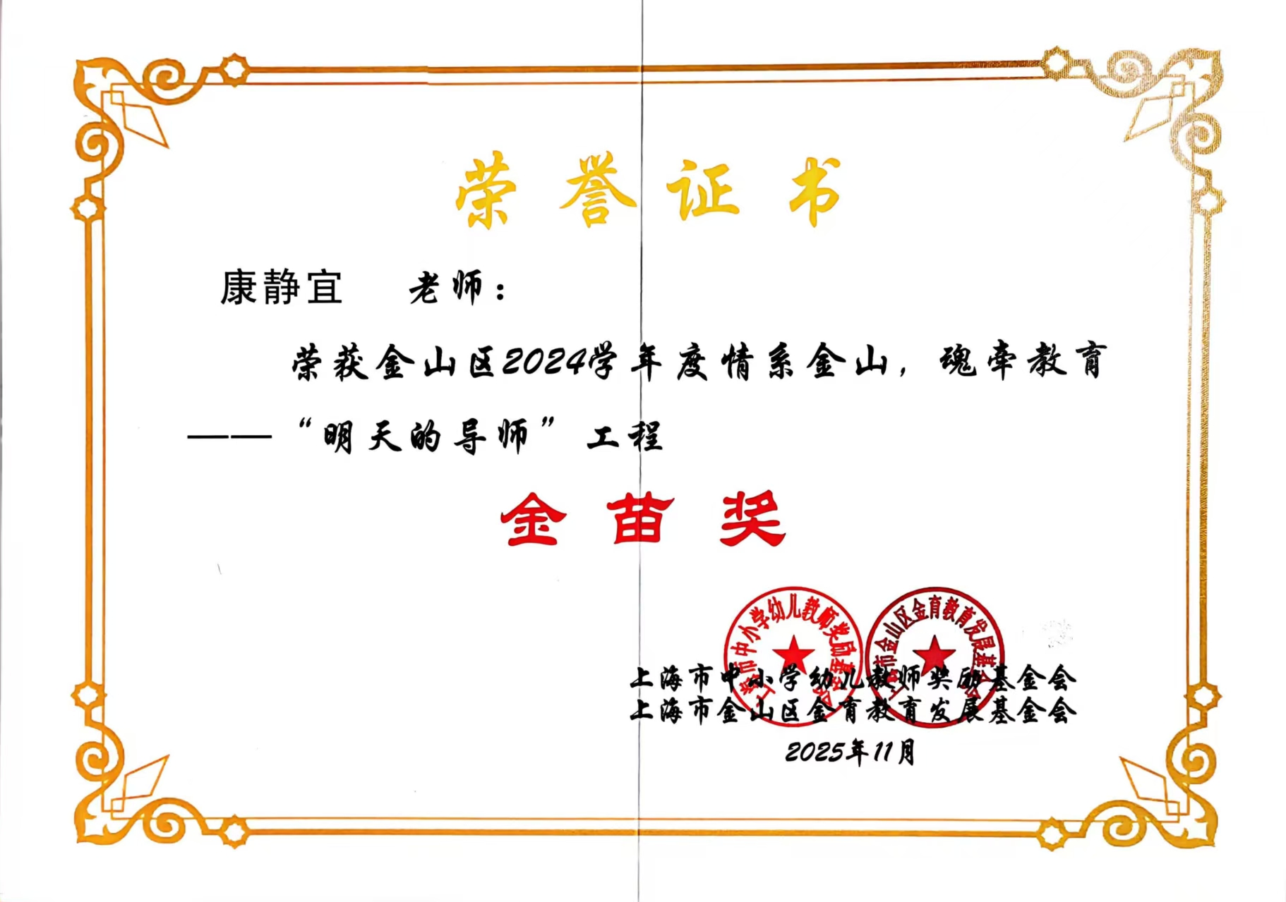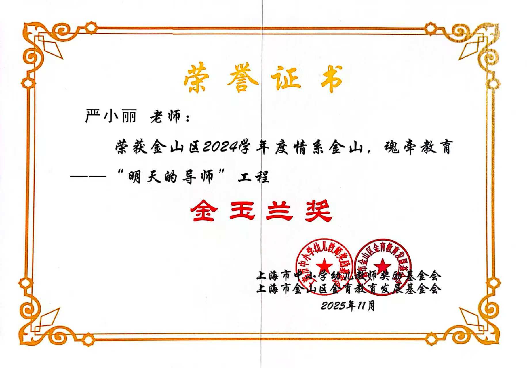 12月3日,“情系金山 魂牵教育”金山区“明天的导师”工程2024学年优秀人员表彰暨工作推进会在区教育学院举行,我校5位教师喜获佳绩,其中严小丽、张海霞获“金玉兰奖”,董少娣、牛亚杰、康静宜获“金苗奖”。
