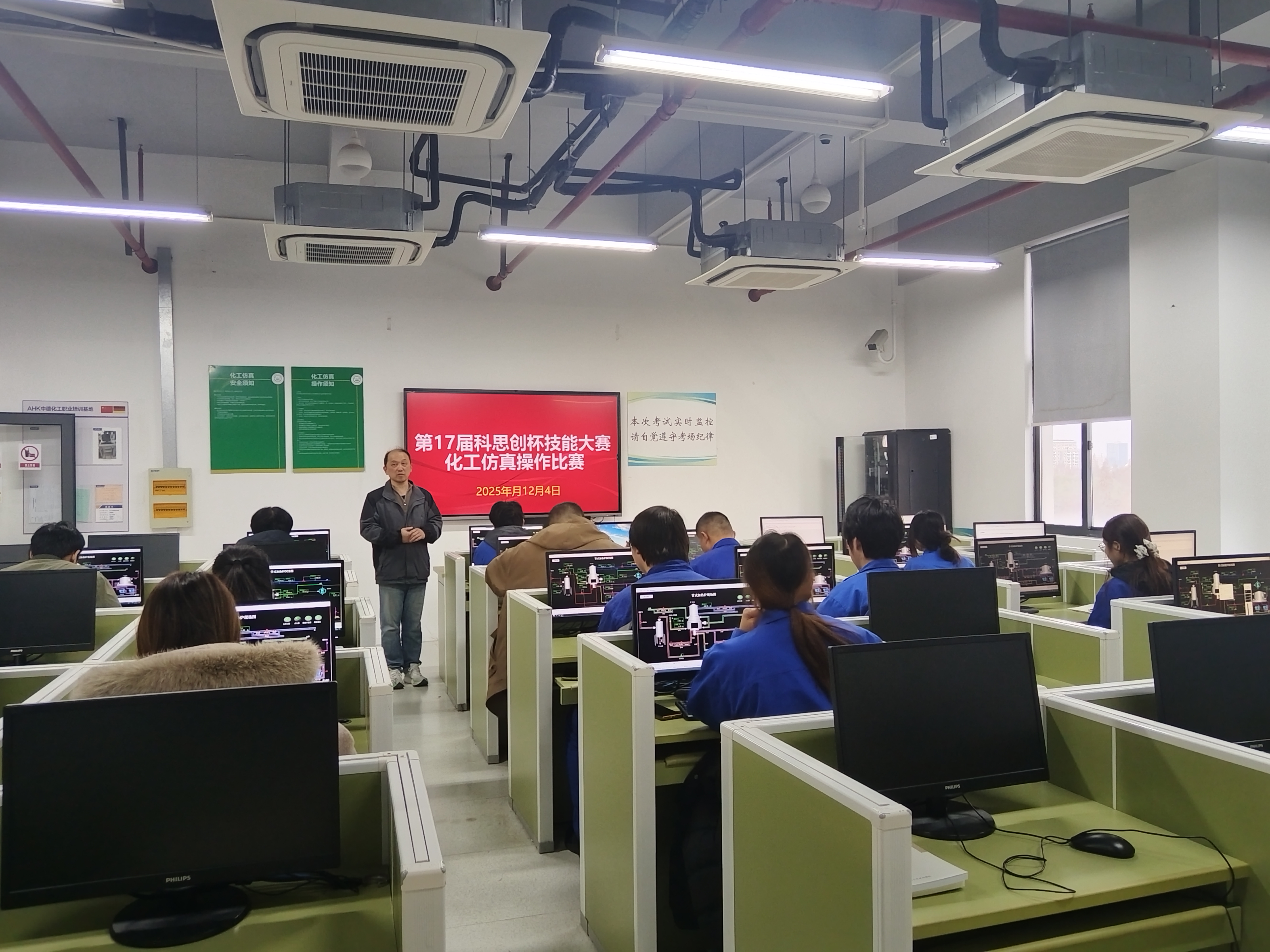 12月4日下午,第十七届“科思创杯”学生职业技能竞赛化工仿真比赛在南区化工楼502仿真机房顺利收官。来自相关专业的70多名参赛学子齐聚赛场,在虚拟化工世界中展开了一场精准与速度的比拼。