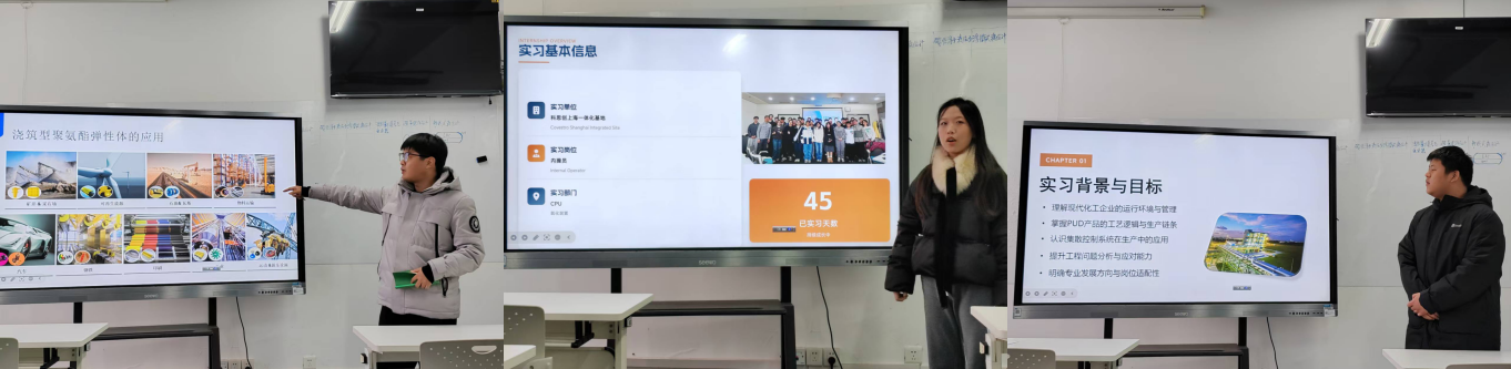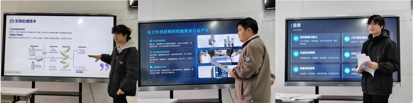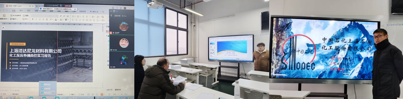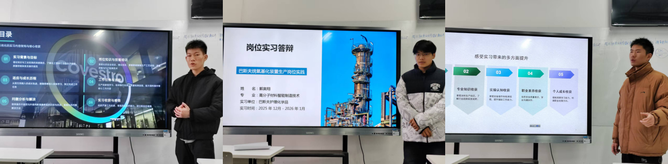 本次答辩围绕毕业设计研究过程与岗位实习操作内容两大核心展开。同学们结合专业所学,呈现了多样且具实用价值的毕业论文,涵盖废弃塑料高值化回收利用、PET化学回收技术、基于回收PET的3D打印线材制备、PC/ABS树脂共混改性等多个前沿方向,选题紧密贴合行业需求与绿色发展趋势。岗位实习分享环节,同学们畅谈在中石化、科思创、洁达、宝武碳业、甘田等知名企业的实践经历,从外操巡检的规范操作到内操中控的参数调控,从开停泵的实操技巧到生产流程的优化思考,生动展现了理论与实践的深度融合。