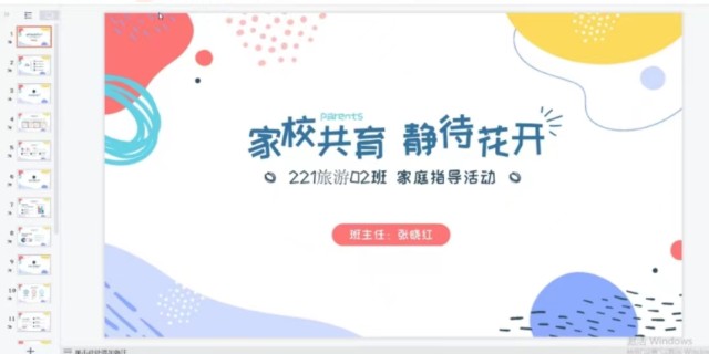 22级主要围绕入校以来学生参加的种种活动,如:运动会、“向上杯”舞蹈比赛、小报制作活动、市级教研活动志愿者等活动展开。班主任张晓红老师表扬了积极参加活动的同学,鼓励其他同学以他们为榜样。针对班级出现的问题,张老师也一一进行了分析说明,呼吁同学们遵守校纪校规,班纪班规,争取做一名合格的中职生。一年级学生的职业学习身份的转变、未来专业技能课程的逐年丰富、家校合力帮助学生与过往不良学习习惯告别等,也是本次家校指导活动学校和家长们共同交流的话题。